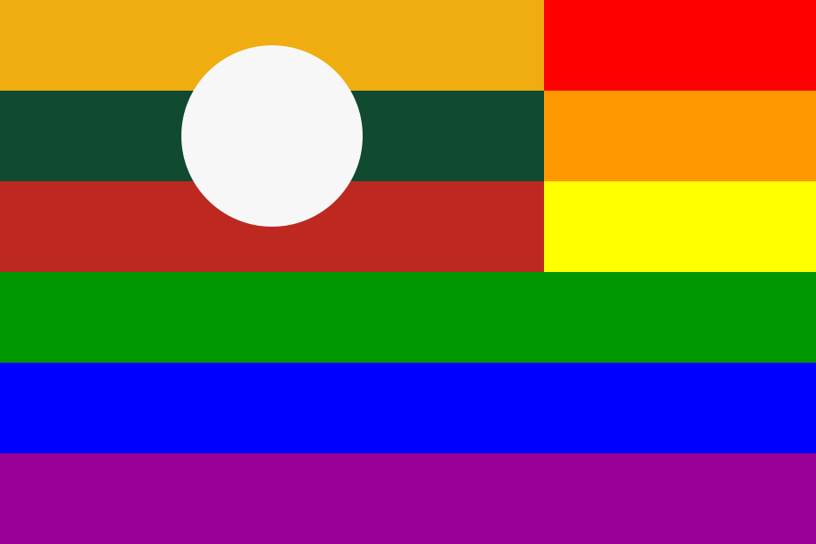 This features a colorful flag with a rainbow design, showcasing the colors of red, orange, green, blue, and purple. In the center of the flag, there is a white circle that appears to be a sun or moon. The vibrant colors and unique design make this flag stand out as an eye-catching piece of artwork.