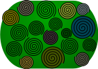 This features a green and brown color palette with various shapes of spirals. There are numerous circles, some of which have swirls in the middle, creating an interesting pattern. These spiral patterns can be found throughout the entire image, giving it a unique and visually appealing appearance. The combination of colors and spiral designs creates a captivating visual experience for anyone who looks at this artistic piece.