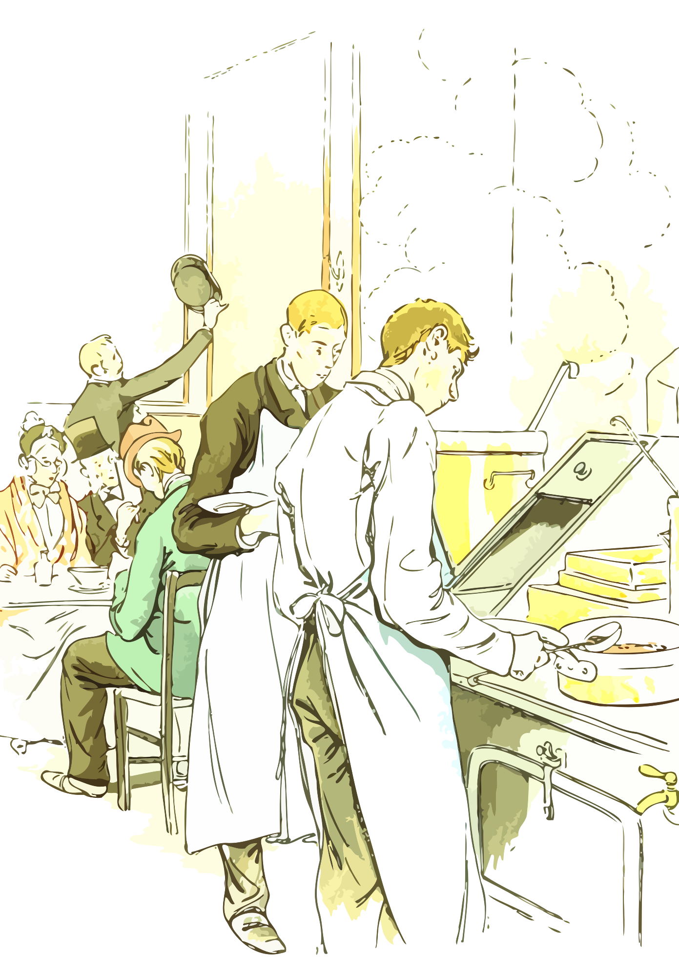 This is a colorful, hand-drawn illustration of two men working in a cafe. One man is standing at the front of the picture holding a ladle over a large pot, while the other man stands next to him holding a plate. In the background, there are people sitting at tables eating and enjoying their meals. The scene appears to be set in an old-fashioned cafe with a cozy atmosphere.