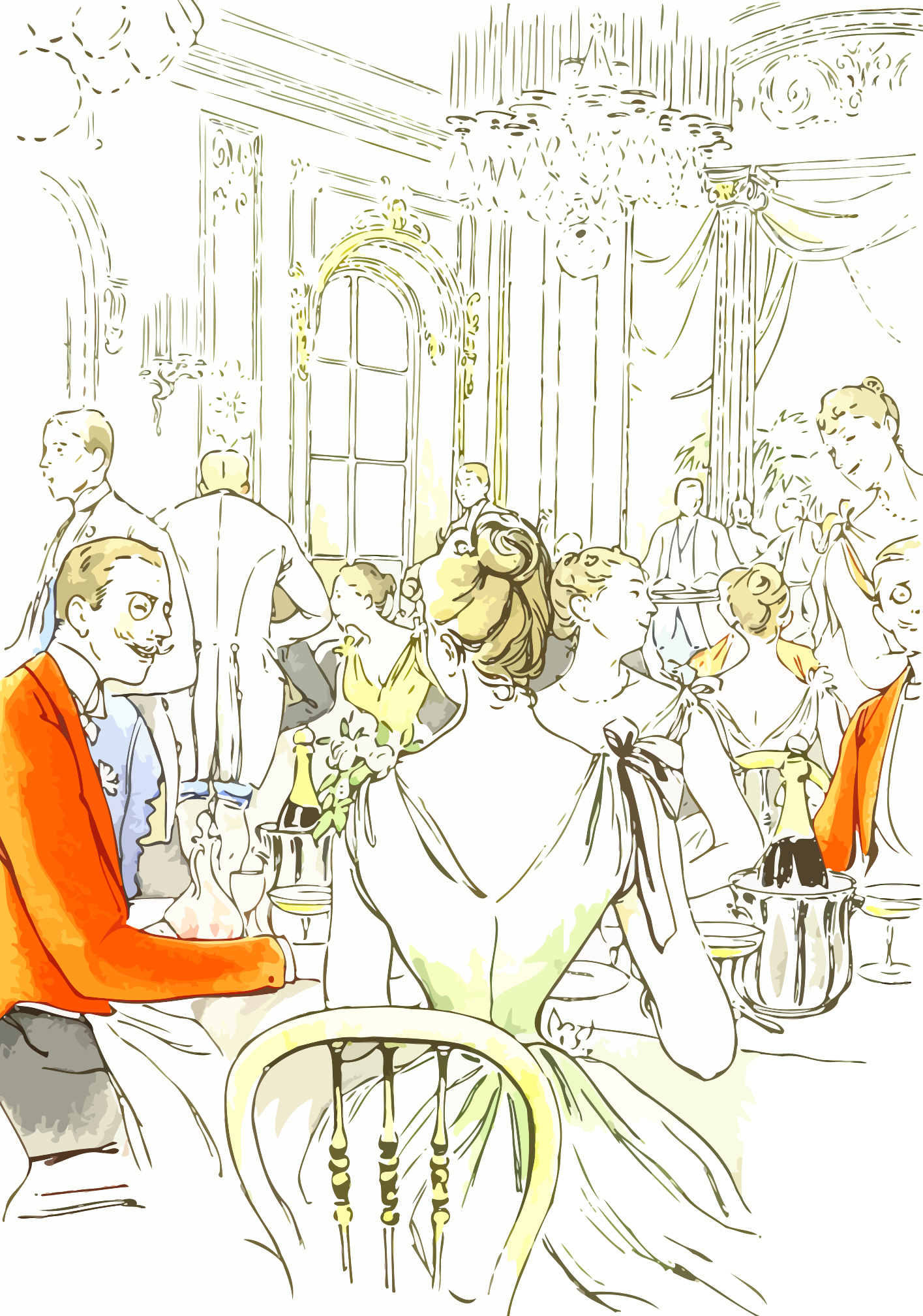 This is a colorful drawing of people in a restaurant, with many individuals sitting and standing around dining tables. There are at least 13 people visible in the scene, engaged in various activities such as eating or conversing. Some guests can be seen holding wine glasses, indicating that they might be enjoying drinks during their meal. The restaurant is furnished with multiple chairs and dining tables, which are scattered throughout the space. There are at least 7 chairs visible in different parts of the room, and 5 dining tables can be seen as well. The overall atmosphere appears to be lively and social, with people enjoying their time together in this elegant setting.