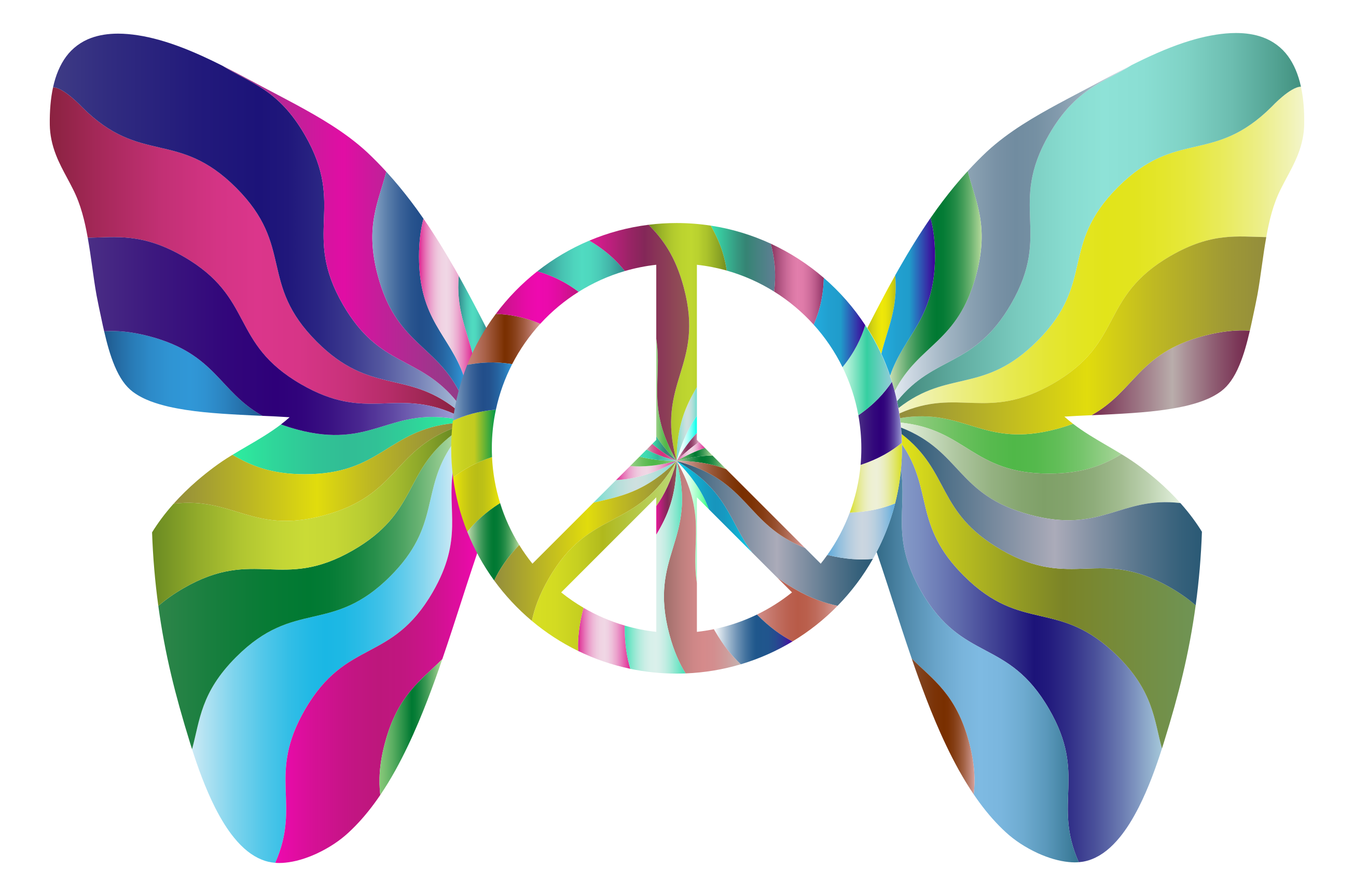 This features a colorful butterfly with its wings spread wide, forming the shape of a peace sign. The butterfly's wings are made up of various colors such as pink, blue, yellow, and green. The peace sign is located in the center of the butterfly's wings, creating an eye-catching and unique design. This artistic representation of a peace sign with a butterfly wing motif can be seen as a symbol of harmony and unity between different cultures or individuals.
