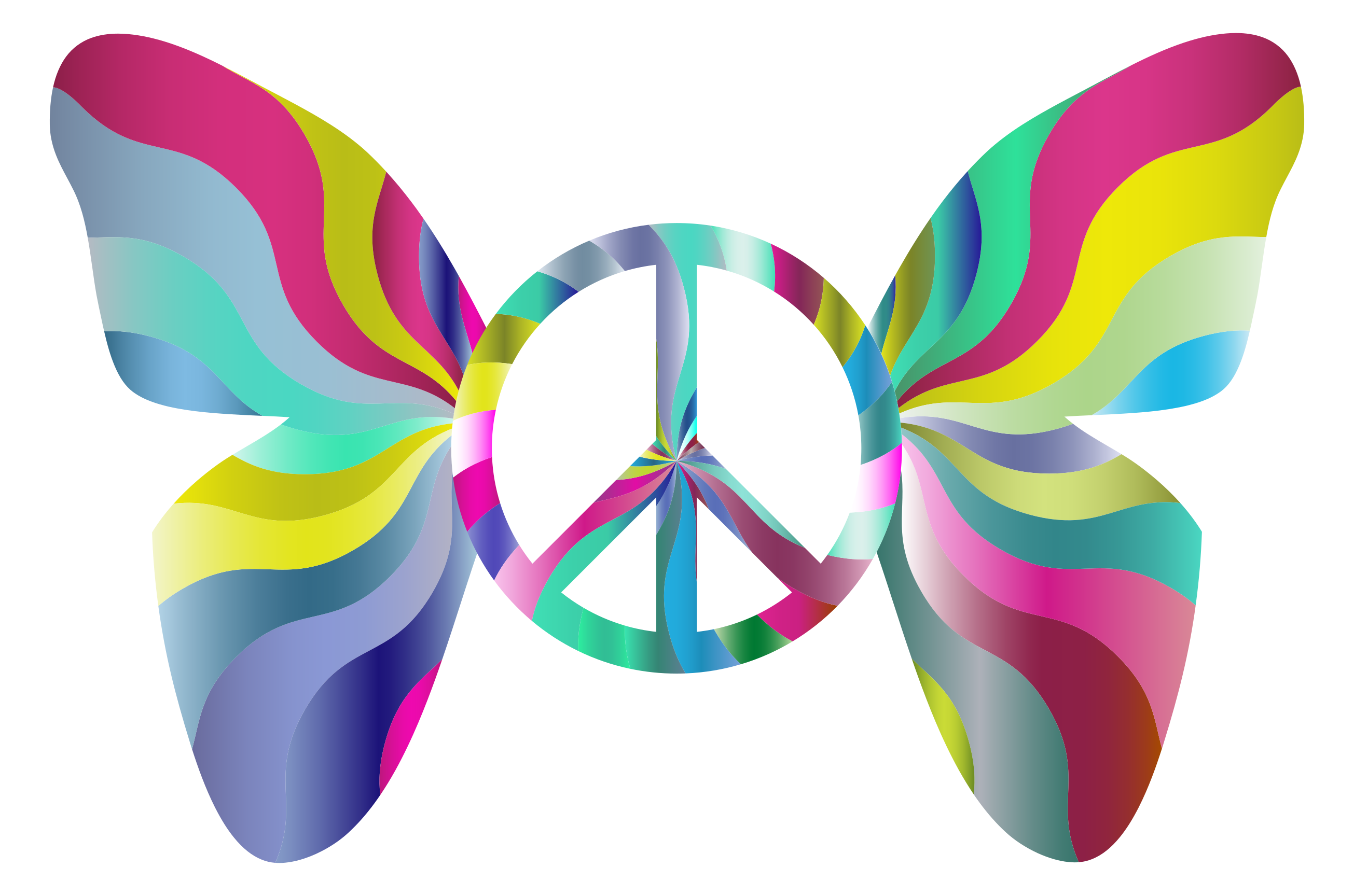 This features a colorful butterfly with its wings spread wide, showcasing the vibrant colors of the rainbow. In the center of the butterfly's wings is a peace sign, which adds a touch of harmony and tranquility to the scene. The combination of the butterfly's wings and the peace sign creates an eye-catching and visually appealing design that conveys a sense of positivity and unity.