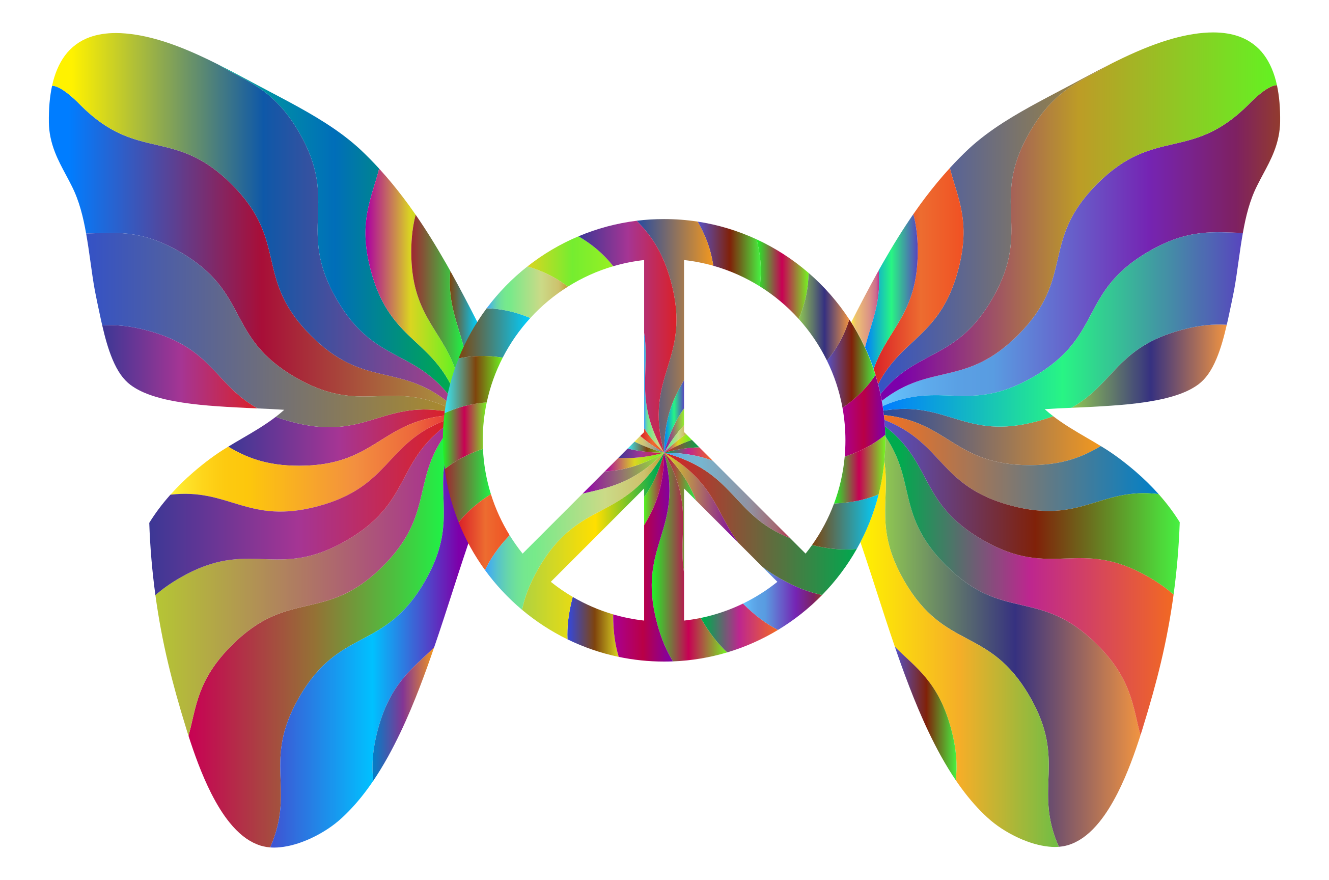 This features a colorful butterfly with its wings spread wide, showcasing the vibrant colors of the rainbow. In the center of the butterfly's wings is a peace sign, symbolizing harmony and unity. The peace sign is surrounded by various shades of red, orange, yellow, green, blue, purple, and pink, creating an eye-catching and lively scene. This unique combination of elements makes for a visually appealing and thought-provoking image.