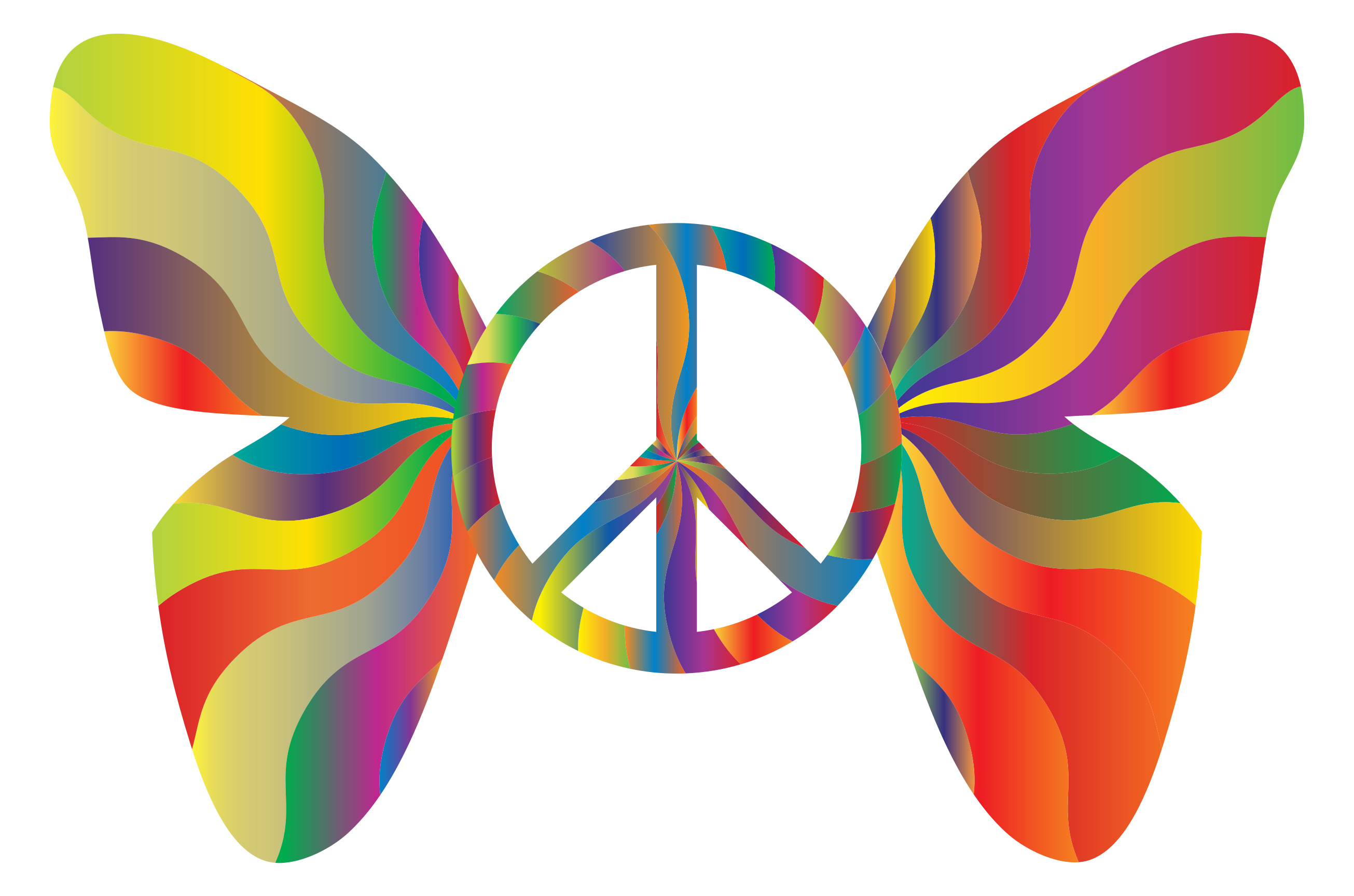 This features a colorful butterfly with its wings spread wide, showcasing the vibrant colors of red, orange, yellow, green, blue, and purple. In the center of the butterfly's wings is a peace sign, symbolizing harmony and unity. The butterfly's wings are positioned in such a way that they form an arc around the peace sign, creating a visually appealing composition. This artistic representation of a peaceful message can be appreciated for its creativity and vivid colors.