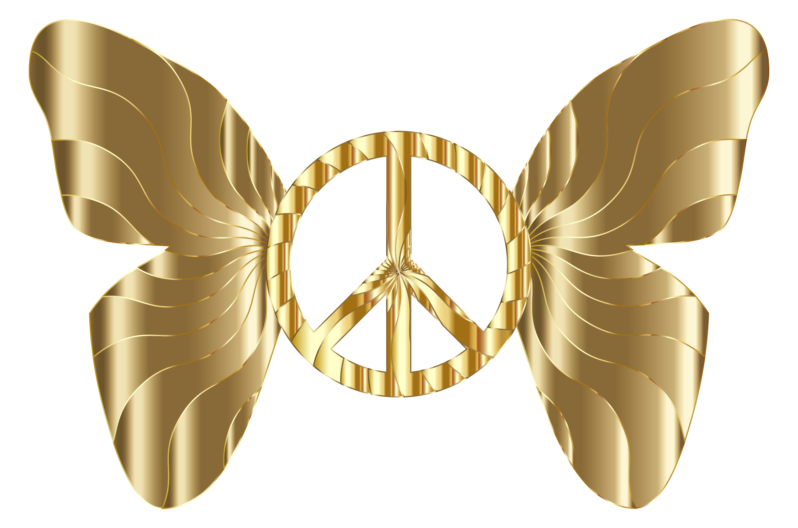 This features a beautiful butterfly with its wings spread wide, adorned with a peace sign. The peace sign is made up of two circles, one on top of the other, and it appears to be gold in color. The butterfly's wings are also golden, adding an elegant touch to the overall design. This unique combination of elements creates a visually appealing image that conveys a sense of harmony and peacefulness.