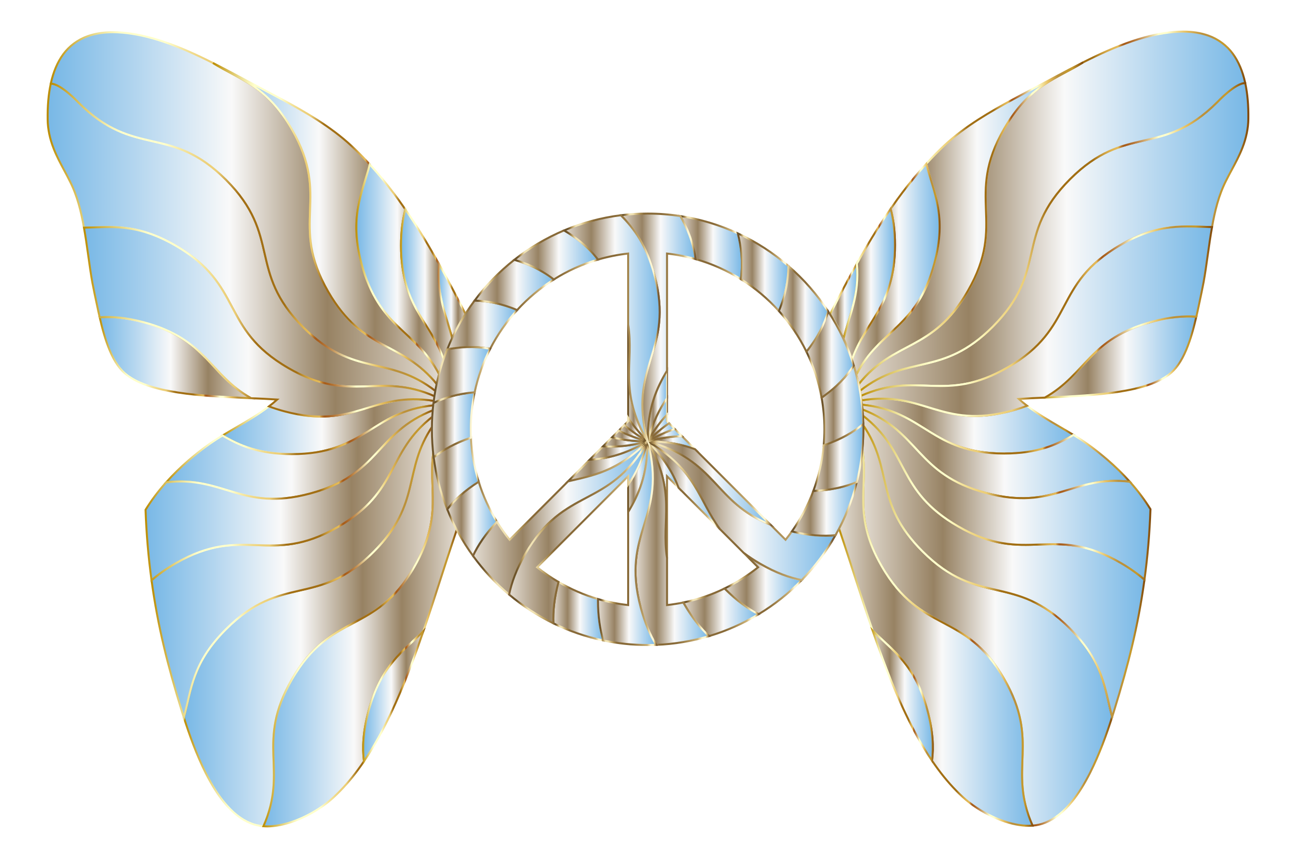 This features a beautiful butterfly with its wings spread wide, showcasing the peace sign symbol. This unique design gives the impression of a blue and gold butterfly with the peace sign as its body. The butterfly's wings are adorned in shades of blue and gold, creating an eye-catching and visually appealing image.