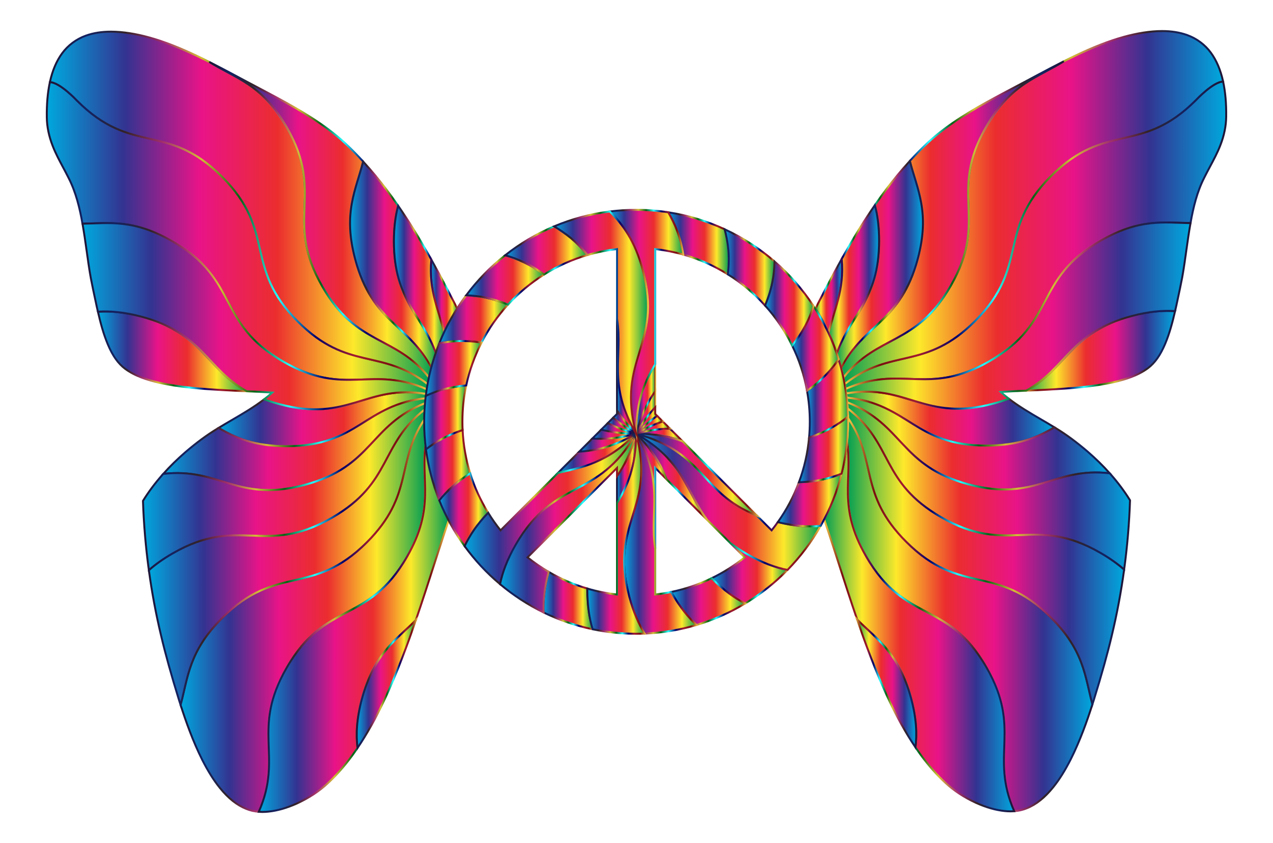 This features a colorful butterfly with a peace sign instead of its body. The butterfly is adorned in various colors, including red, blue, green, yellow, and orange. It has a rainbow-colored wing that adds to the vibrant appearance of the design. The peace sign is prominently displayed on the butterfly's chest, making it an eye-catching and unique piece of artwork.