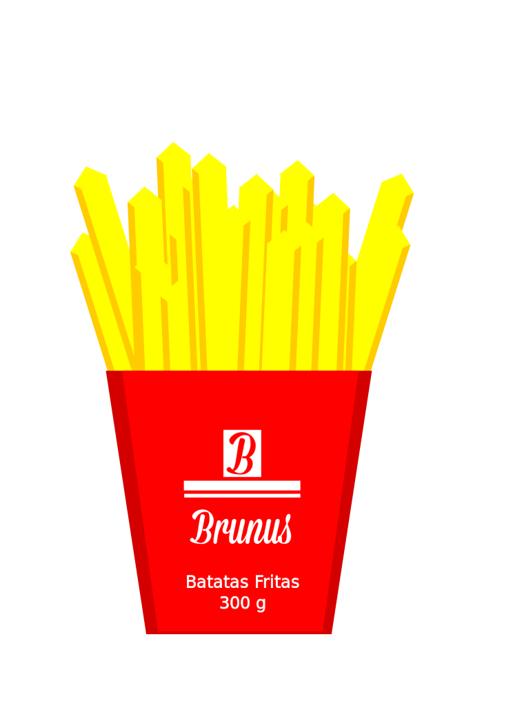 This features a red paper bag with yellow french fries inside. The bag is labeled "Brunus" and has the words "batatas fritas" written on it, indicating that these are potato chips. There are several different types of potatoes visible in the bag, adding to its visual appeal. Overall, this image showcases a delicious snack option with a distinctive red paper bag.