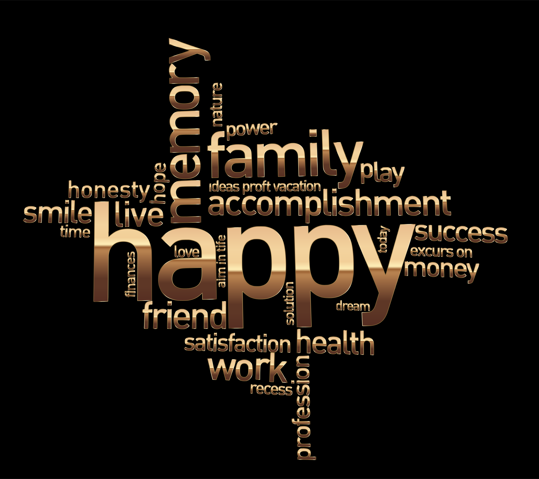 This is a close-up of the word "Happy" written in gold, with various related words surrounding it. These words include phrases such as "smile," "satisfaction," and "accomplishment." Other words like "success," "money," and "friendship" are also present in the image. The overall effect is a visually appealing representation of the concept of happiness, with various related terms surrounding it.