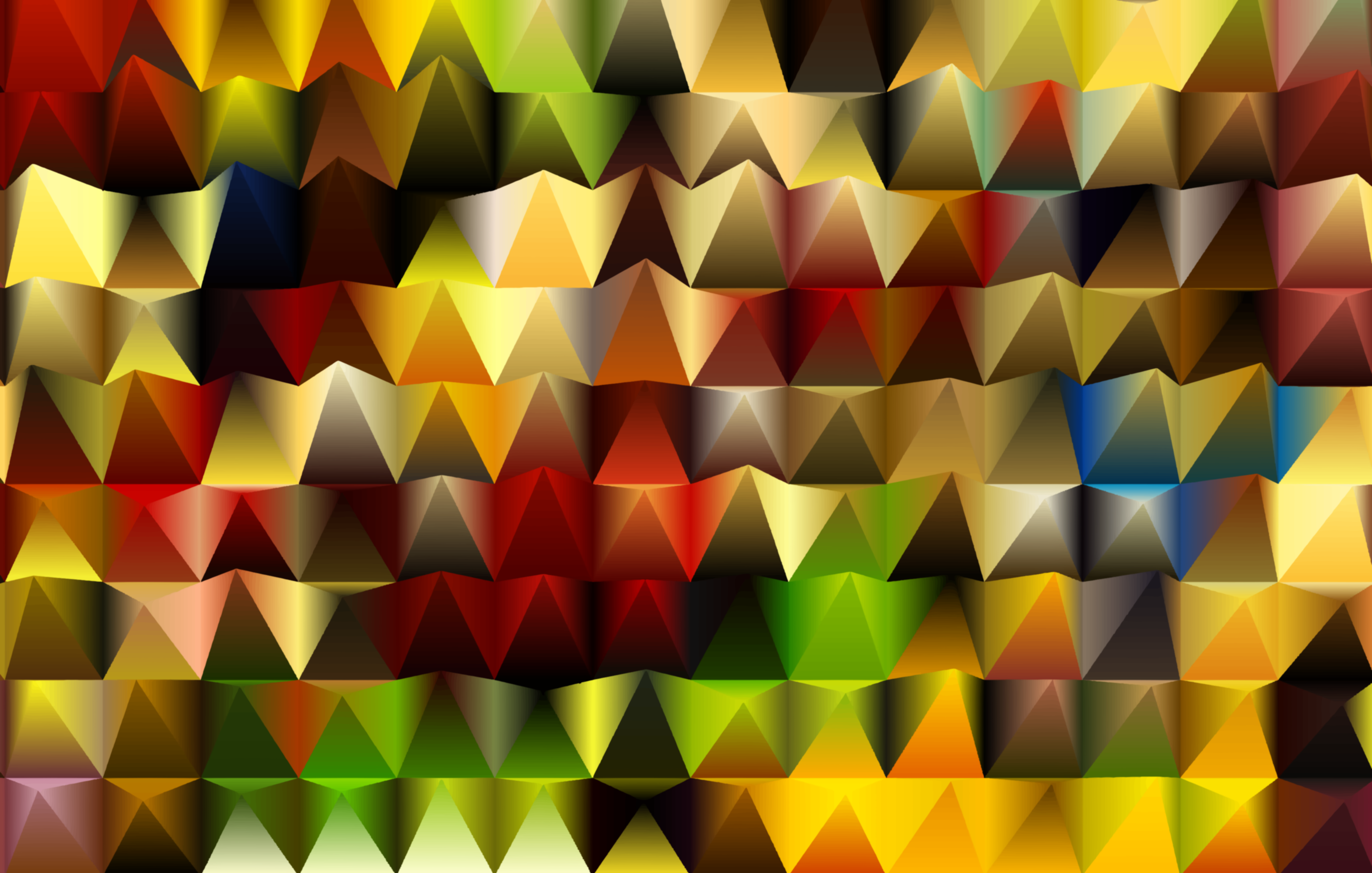 This is a colorful and intricate pattern of triangles, with each triangle having different colors. The pattern appears to be made up of many small triangles that are arranged in various shapes and sizes. The colors used in the pattern are vibrant and varied, creating an eye-catching visual effect. This artistic design could be used for a variety of purposes such as wallpaper, fabric patterns or even as a decorative element on clothing or accessories.