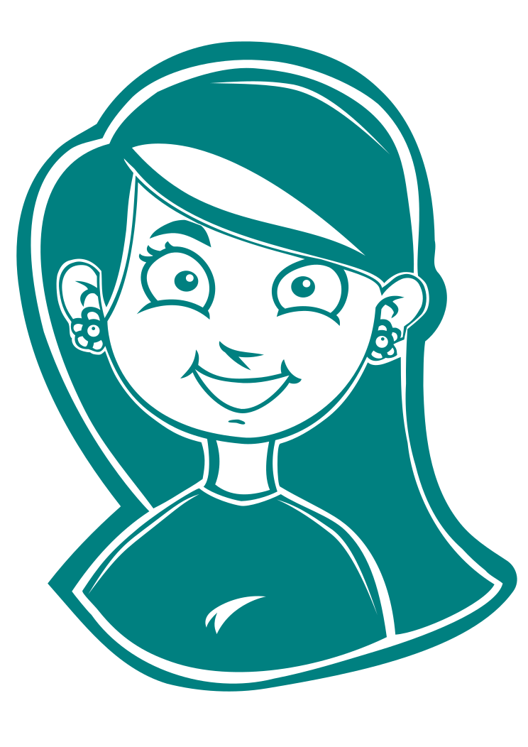 This features a cartoon drawing of a smiling girl with long hair. She is wearing earrings and has a green shirt on, which adds to her unique appearance. Her eyes are wide open, giving the impression that she's surprised or excited about something. The overall design of the image is reminiscent of an old-fashioned style, with a touch of modernity in the form of the girl's green shirt and transparent background.