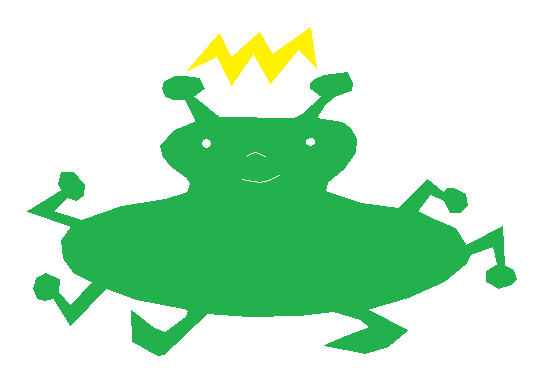 This features a green cartoon character with a yellow crown on its head. It appears to be an alien or a creature from another world, as it is depicted in a whimsical and playful manner. The character has large eyes and a smile on its face, giving the impression of being friendly and approachable. Its legs are spread out, suggesting that it might be in motion or simply enjoying its surroundings. Overall, the image conveys a sense of fun and lightheartedness with its colorful and imaginative character design.