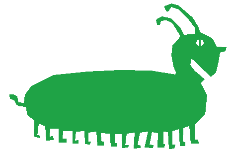 This features a green cartoon-like creature with long legs and antennae. It appears to be an insect or a similar type of animal, possibly resembling a grasshopper or a dragonfly. The creature is standing on the ground, occupying most of the frame from left to right. Its unique design and color make it stand out as a visually interesting subject in the image.
