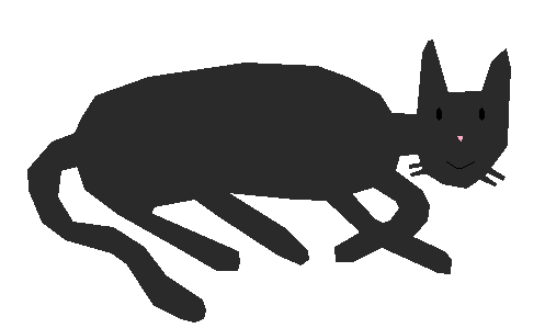 This features a black cat lying on its side, with one paw raised. It appears to be smiling as it lays down in the middle of the scene. The cat is positioned towards the left side of the image and takes up a significant portion of the frame. The background is white, providing a clean and simple backdrop for the cat's relaxing pose.