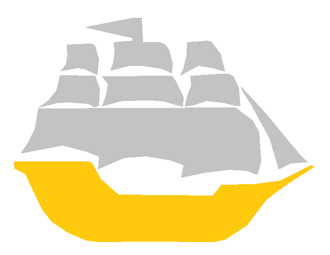 This features a large sailboat with its sails down, floating on the water. The boat is white and yellow in color, giving it an old-fashioned appearance. It appears to be a drawing or painting of the ship, possibly used as a logo or decorative element. The boat's design suggests that it may have been used for transportation or trade in the past, adding a sense of history and charm to its presence on the water.