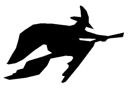 This features a black and white silhouette of a witch or a person dressed as a witch, flying on a broom. The witch is depicted in mid-flight, with the broom extending outwards from underneath them. The silhouette creates an interesting visual effect that highlights the shape and movement of the figure. This image could be used for various purposes such as artwork or decoration, particularly during Halloween season when witches are a popular theme.