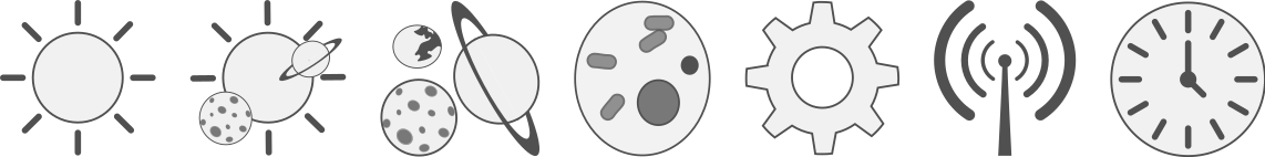This features a collection of six small icons arranged in a row. Each icon represents a different concept, including a star, two planets, three planets, a cell, a gear, and a radio signal. These icons are placed on top of each other, creating an interesting visual arrangement. Additionally, there is a clock located at the far right side of the image, which adds to the overall composition. The combination of these various elements creates a unique and intriguing illustration.