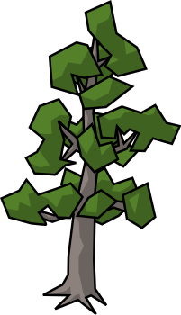 This features a cartoon-like drawing of a tree with green leaves on its branches. The tree has a grayish brown trunk and is surrounded by several smaller trees, creating an overall impression of a forest scene. The tree appears to be the central focus of the image, with the other trees surrounding it in various positions. This artistic representation of nature adds a unique touch to the visual experience.