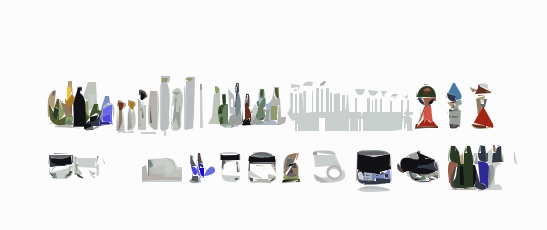 This features a collection of various items, including bottles and cups. There are numerous bottles scattered throughout the scene, with some placed closer to the foreground while others are further back in the frame. A few cups can also be seen among the bottles, adding variety to the assortment of objects. The arrangement of these items creates a visually interesting composition that showcases the different shapes and sizes of each object.