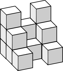 This features a large stack of white blocks, which are arranged in a way that creates an interesting pattern. There are nine distinct blocks visible in the image, with each block being slightly different in size and shape. The arrangement of these blocks gives off a sense of depth and complexity, making it an intriguing visual display. This could be used as a reference for creating exercises related to the soma-cube or other similar puzzles that involve manipulating geometric shapes.