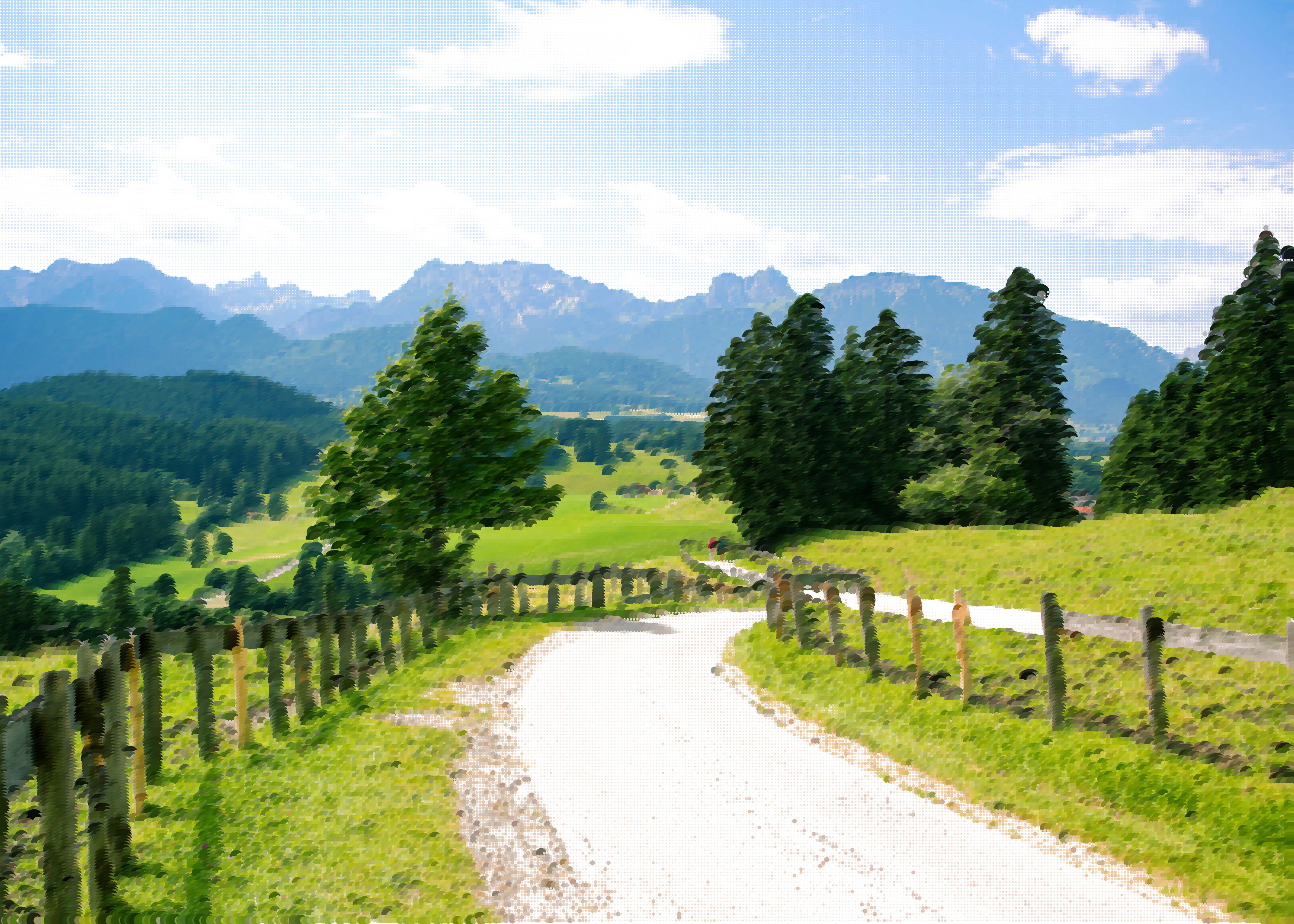 This features a picturesque country road surrounded by lush green fields and mountains in the background. Along the path, there are several trees providing shade and adding to the scenic beauty of the area. A dirt road can be seen leading through the countryside, with a fence on either side, creating a sense of seclusion from the surrounding environment. The landscape is further enhanced by the presence of cows grazing in the distance, contributing to the peaceful and idyllic atmosphere of the scene.
