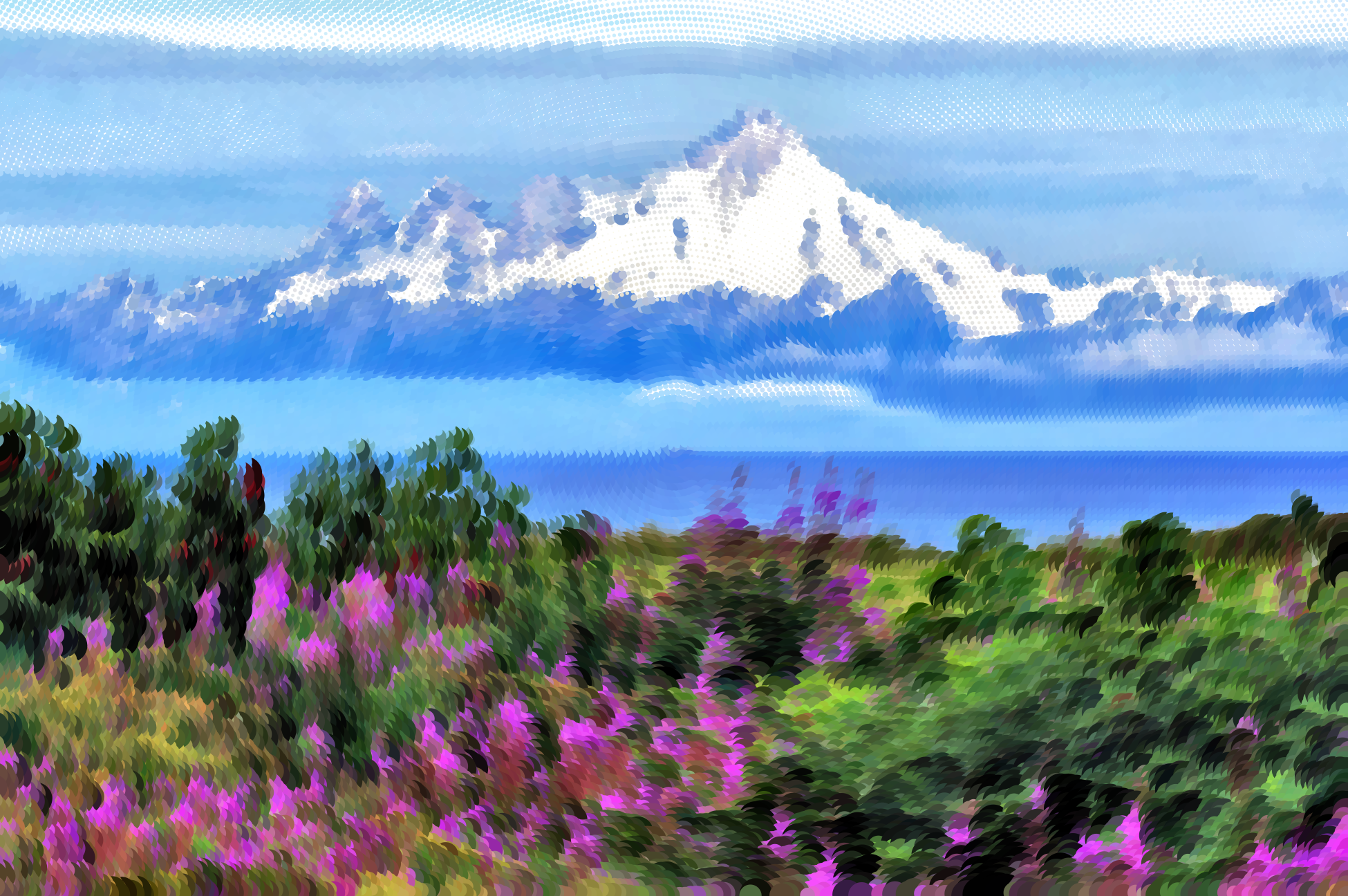 This features a beautiful landscape with a mountain in the background, covered in snow. In front of this majestic mountain range, there is a field filled with purple flowers, creating a vibrant and colorful scene. The sky above the mountains appears to be blue, adding to the serene atmosphere of the picture. This picturesque setting evokes feelings of tranquility and appreciation for nature's beauty.