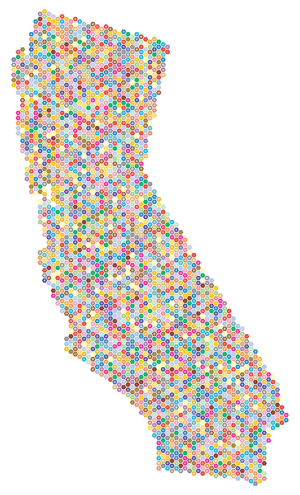 This features a large, colorful map of California. The state is depicted in a unique and creative way by using a variety of different colored dots to represent the various counties that make up the state. These dots are scattered all over the map, creating a visually striking representation of the Golden State. The use of these brightly colored dots adds an artistic touch to the otherwise traditional depiction of California on a map.