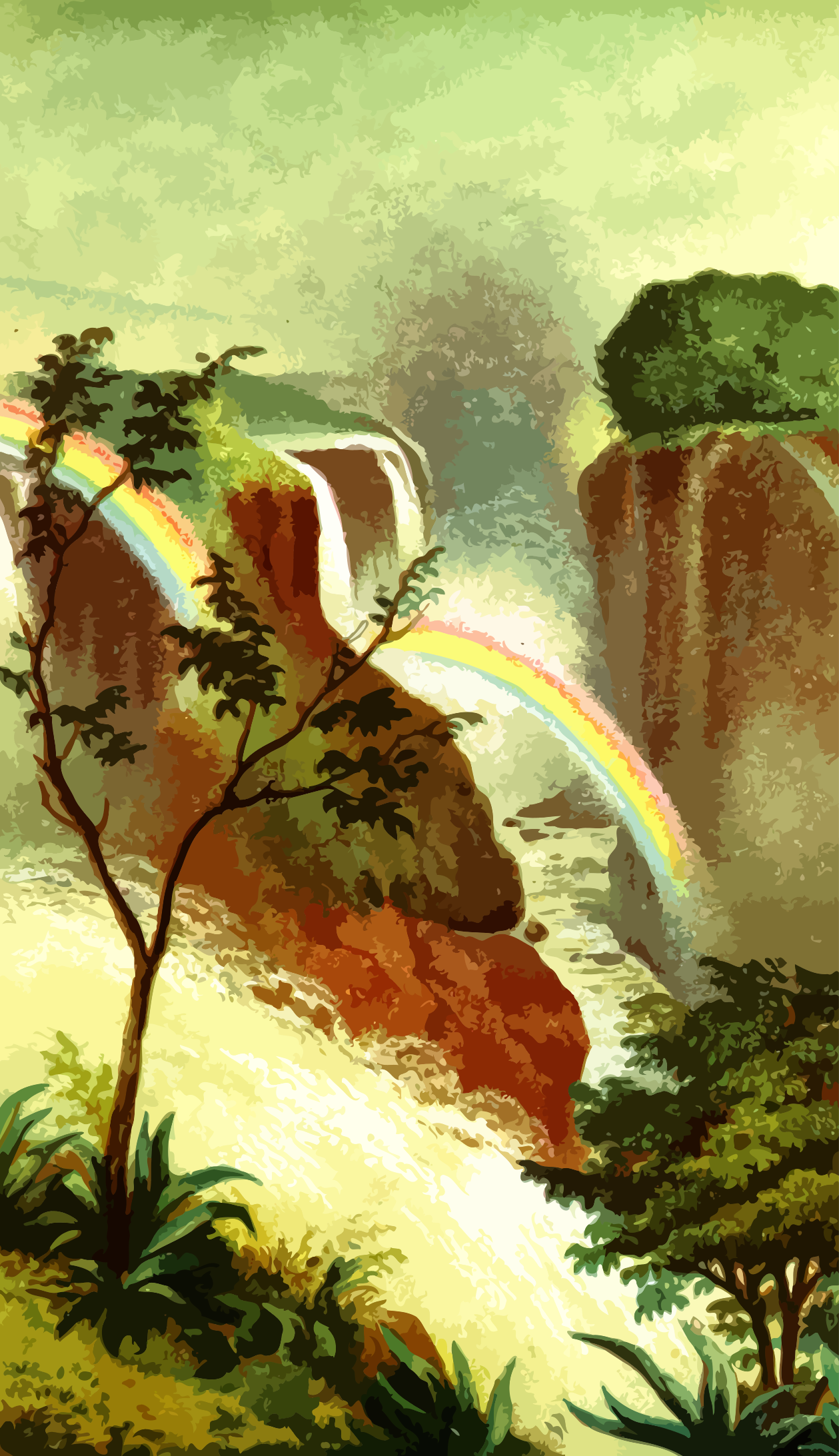 This features a painting of a waterfall with a rainbow in the background. The waterfall is located on a cliff, and there are trees surrounding it. In addition to the waterfall, there is another smaller waterfall visible in the scene. A tree can be seen near the left side of the painting, while two more trees are positioned towards the right side. The overall atmosphere of the painting suggests a serene and picturesque landscape.