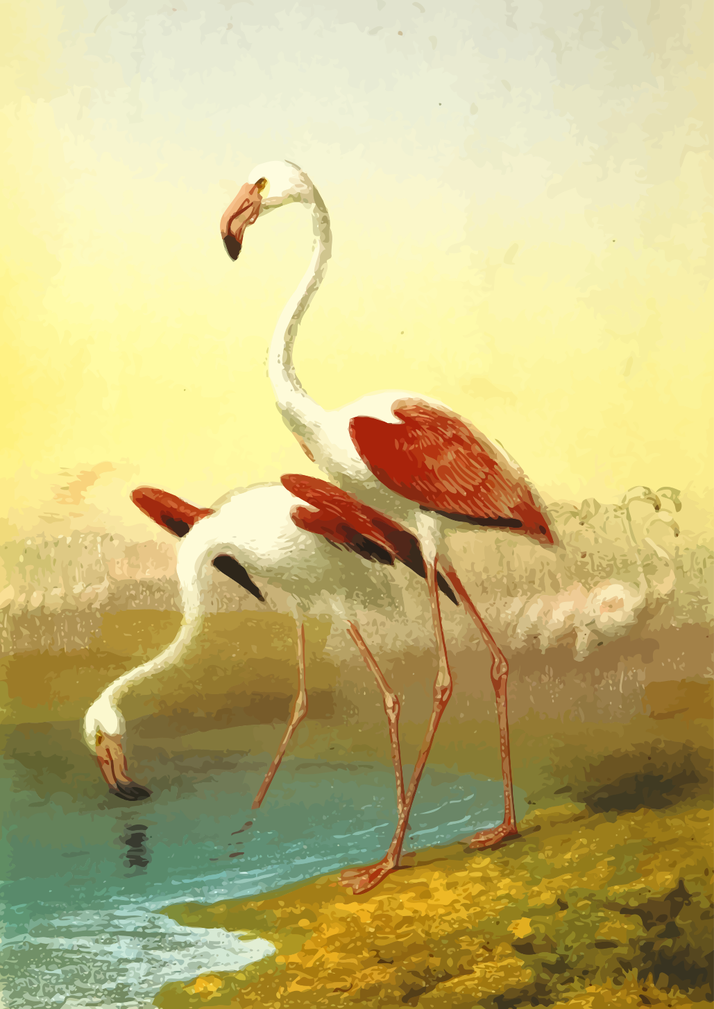 This features a beautiful painting of two flamingos standing on the shore of a body of water. They are positioned close to each other, with one bird slightly behind the other. Both birds have their heads tilted downwards, possibly drinking from the water or searching for food. The scene is set against a backdrop of a sunny day, creating an idyllic and serene atmosphere. The flamingos are depicted in vibrant colors, with one bird being predominantly red while the other has a mix of pink and white hues. This artistic representation captures the essence of these exotic birds in their natural habitat.