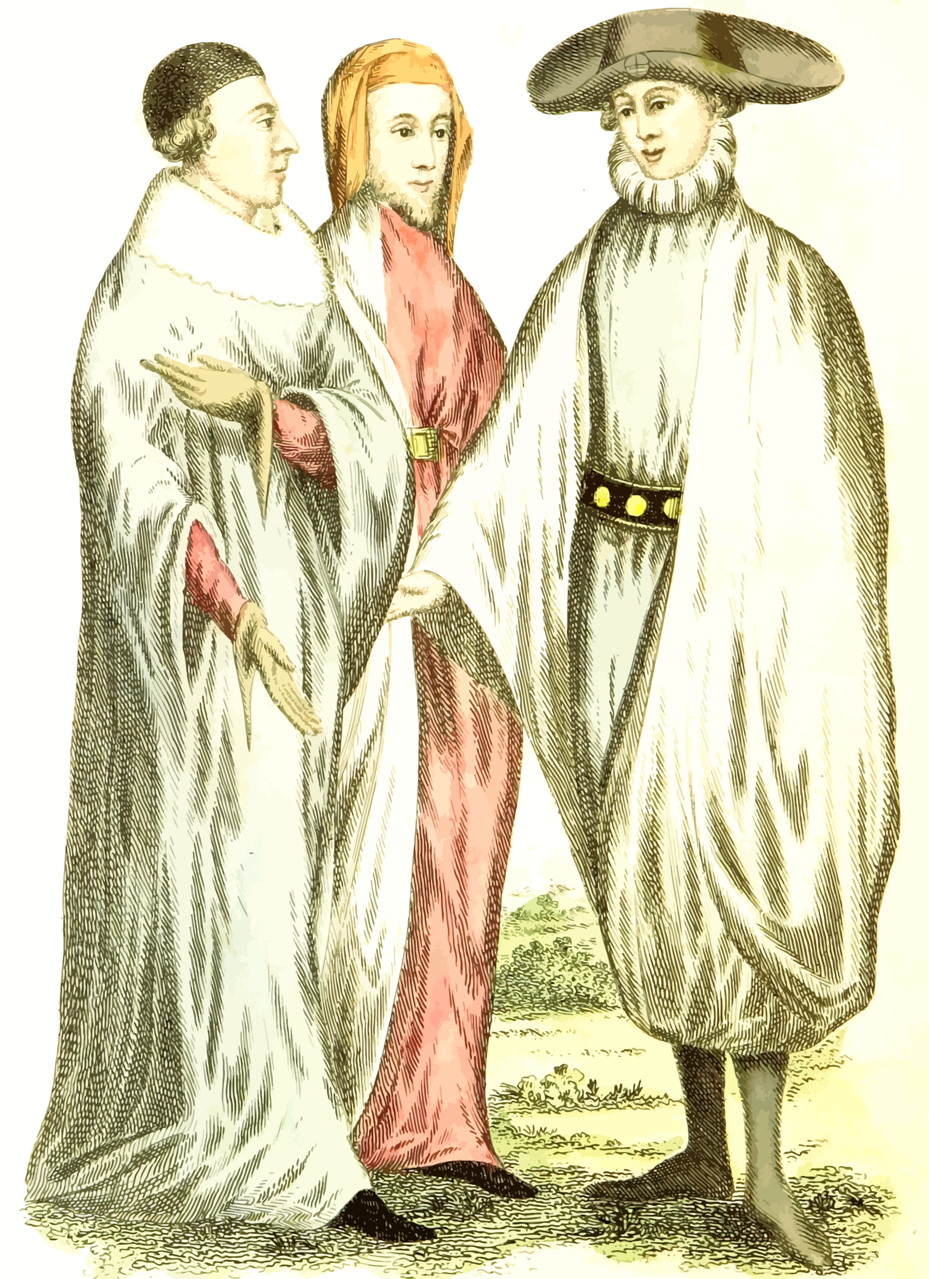 This features a group of three people standing together in an outdoor setting. They are all dressed in long robes, with one person wearing a hat and another wearing a cape. The individuals appear to be engaged in conversation or possibly participating in some sort of ceremony. The scene is depicted in black and white, giving it a classic feel. Each person's attire is distinctive, with the man on the left wearing a cape, the woman in the middle dressed in red, and the third person on the right also wearing a hat. The group seems to be composed of different individuals, possibly representing various roles or professions within their society.