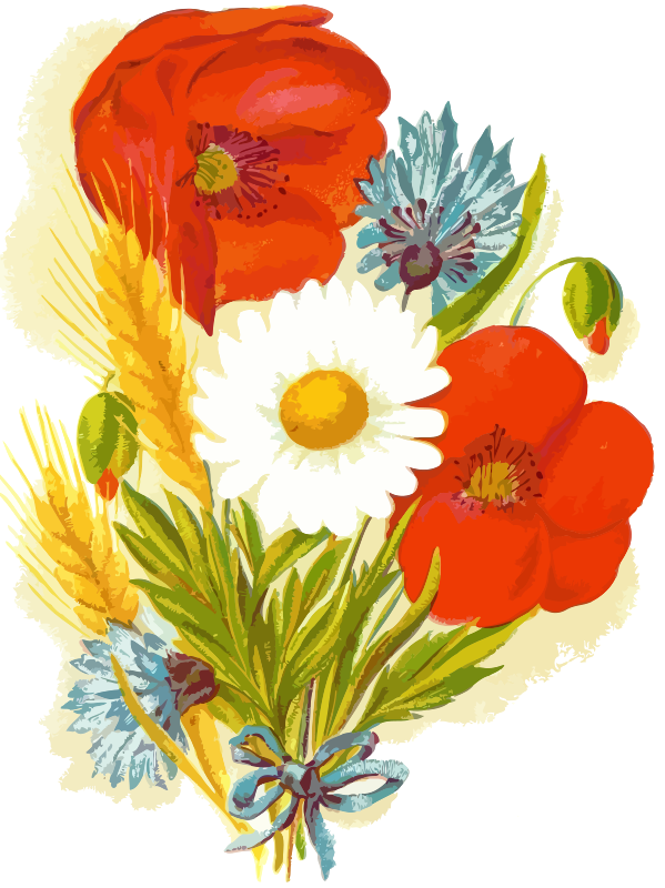 This features a colorful bouquet of flowers, including red poppies and white daisies. These flowers are arranged in an artistic manner, with some placed on top of each other to create a visually appealing display. There is also a bow tied around the bouquet, adding a touch of elegance to the arrangement. The combination of different colored flowers creates a vibrant and lively atmosphere, making it an attractive centerpiece for any setting.