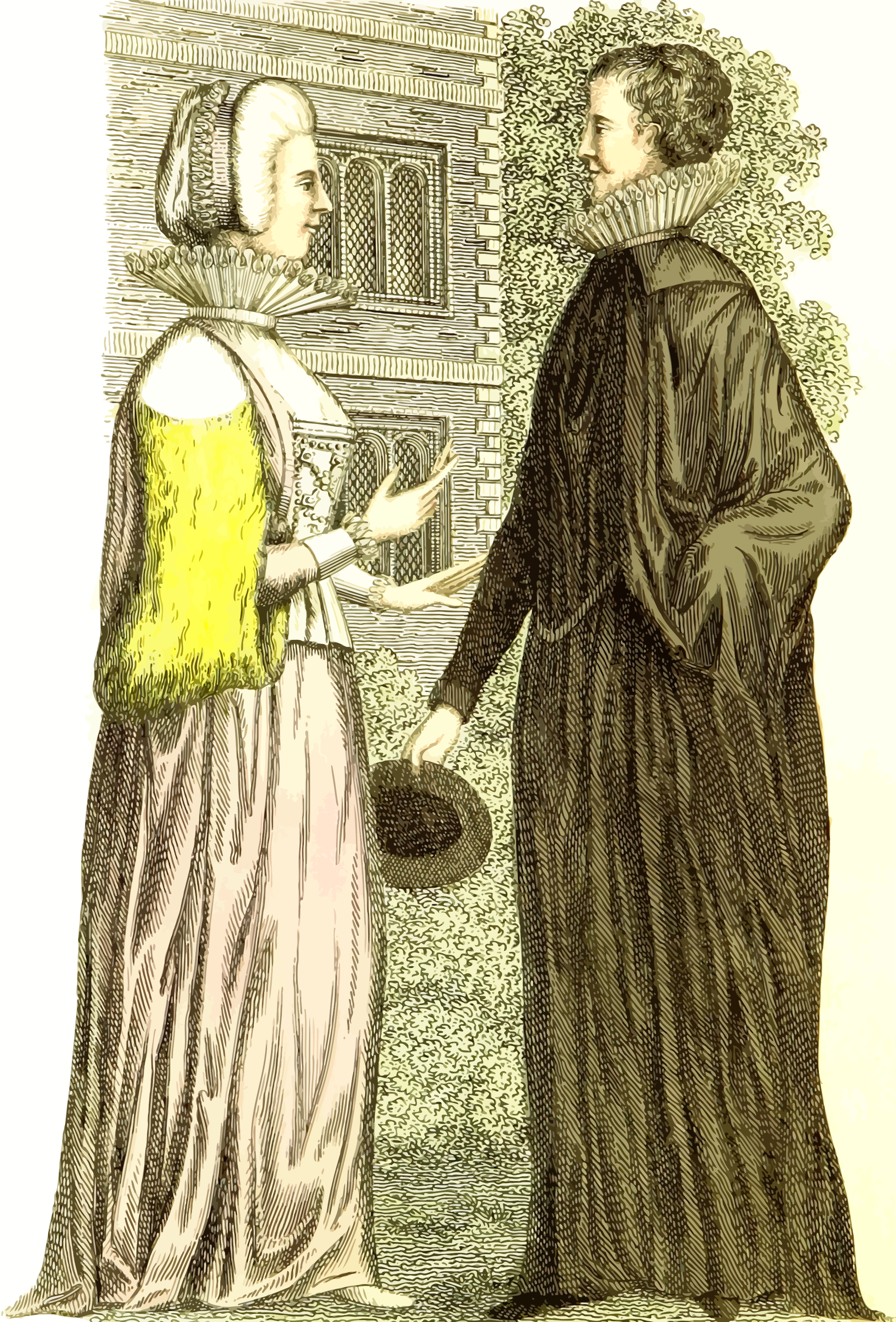 This features a man and woman standing next to each other, both dressed in old-fashioned clothing. The woman is wearing a yellow dress with a ruffled collar, while the man is dressed in a black robe. They appear to be engaged in conversation or possibly exchanging something, as they are holding hands and looking at one another. The scene takes place outdoors, with trees visible in the background. The woman's dress has a pink hue, adding a touch of color to the otherwise monochromatic image. The man is wearing a ruffled collar, which further emphasizes his old-fashioned attire. Overall, the scene captures a moment from a bygone era, with the two individuals dressed in clothing reminiscent of the 17th century.