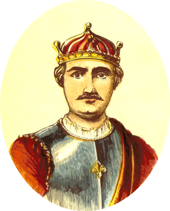 This features a man wearing a crown and holding a scepter, depicted in an old-fashioned style. He is dressed in royal attire with a suit and a cape, giving him the appearance of a king or a nobleman from a bygone era. His facial expression appears to be serious as he stares directly into the camera. The man's outfit and the overall composition of the image suggest that it could be an illustration or portrait from a historical period.