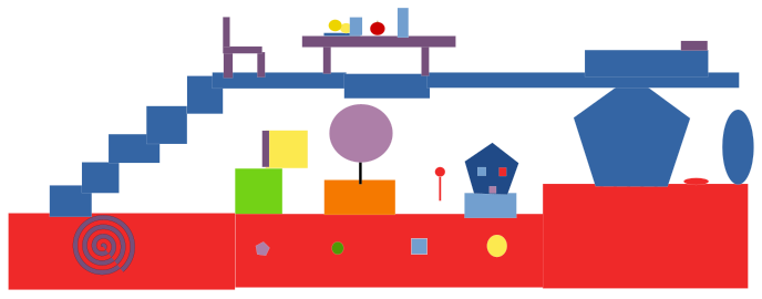 This depicts a colorful and playful scene inside of a house. The interior is filled with various objects, including a red floor and blue stairs. There are several toys scattered throughout the space, adding to the vibrant atmosphere. A chair can be seen in the room, along with a dining table that has multiple items on it. Additionally, there are two bowls placed near the center of the scene, further enhancing the playful and inviting ambiance of this house interior.