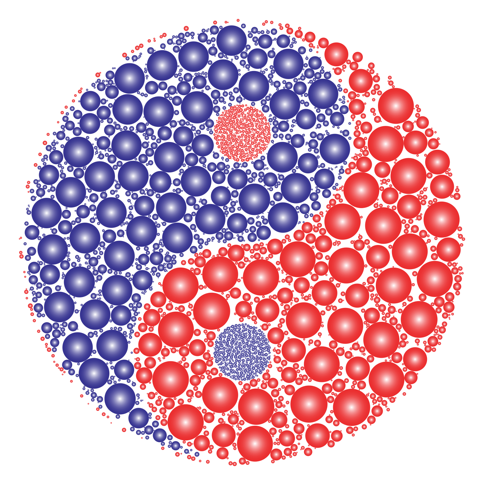 This features a large, colorful circle made up of many small circles. These smaller circles are arranged in various positions around the larger circle, creating an intricate and visually appealing pattern. In the center of this pattern, there is a red dot surrounded by blue dots, which adds a pop of color to the overall design. The combination of red and blue colors, along with the numerous small circles, gives the impression of a yin-yang symbol, representing balance and harmony.