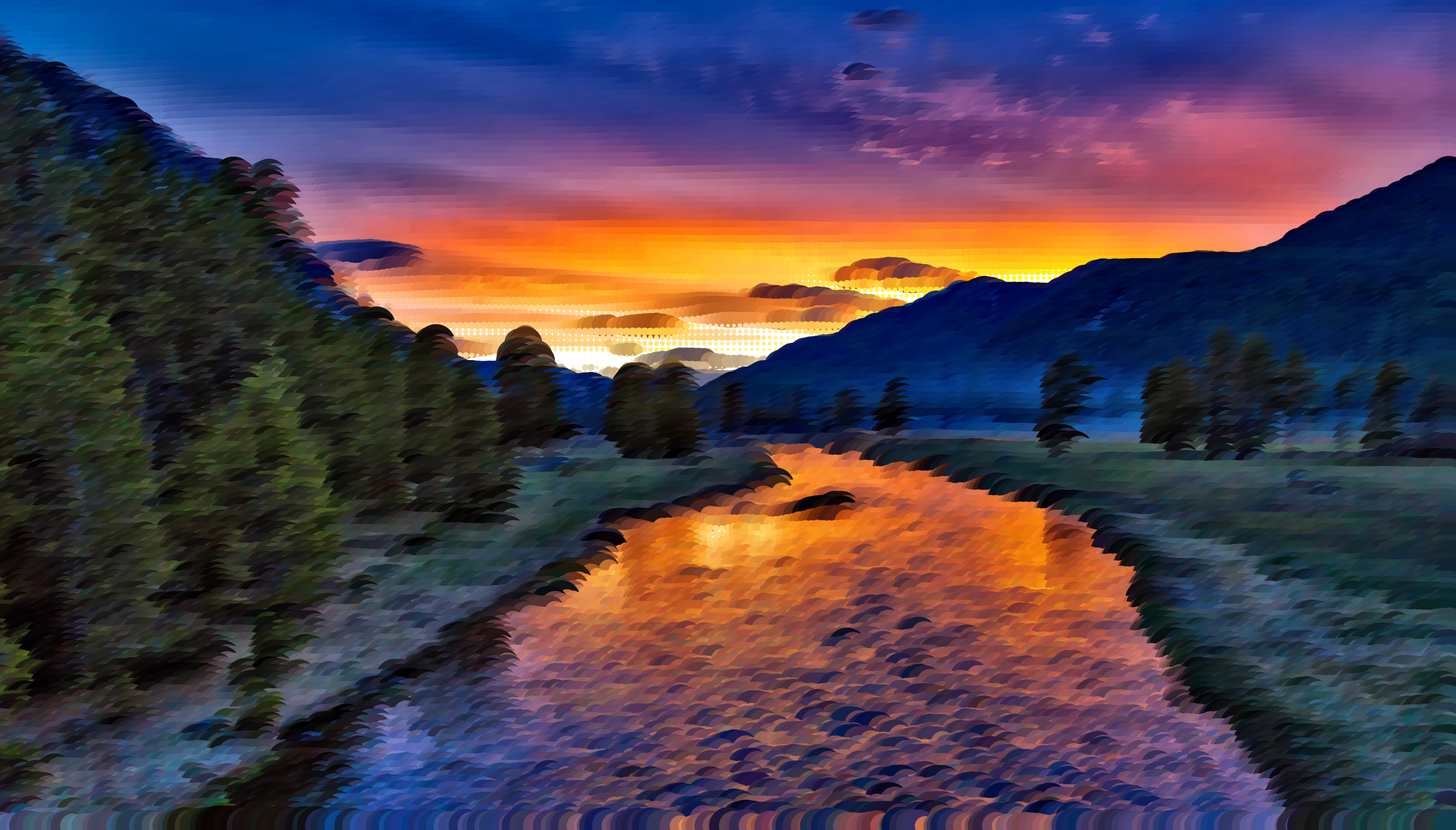 This captures a serene scene of a river flowing through a valley with mountains in the background. The sun is setting, casting a warm glow on the landscape and creating a picturesque view. There are several trees lining the banks of the river, adding to the natural beauty of the scene. In addition to the trees, there are also a few birds flying above the water, further enhancing the tranquil atmosphere. The combination of the sunset, the flowing river, and the presence of wildlife creates an idyllic and peaceful setting for this image.