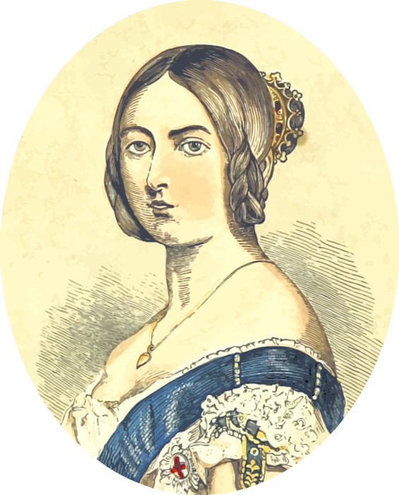 This features a woman wearing a blue ribbon and lace around her neck, with a crown on top of her head. She appears to be staring directly at the viewer, giving off an intense and focused expression. The drawing is in black and white, which adds a classic and timeless feel to the portrait. The woman's attire suggests that she might be from a royal or noble family, as the crown on her head further emphasizes this notion. Overall, the image captures a powerful and regal figure with an intriguing gaze.