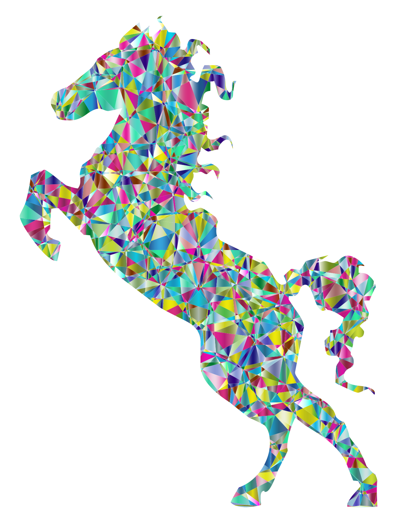 This features a horse, which is the central focus of the scene. It appears to be a colorful and vibrant representation of the animal, with its colors and patterns creating an eye-catching visual effect. The horse's mane is particularly noticeable, as it stands out against the rest of the image. The overall composition of the picture showcases the horse in various positions, giving the viewer a sense of depth and movement within the scene.