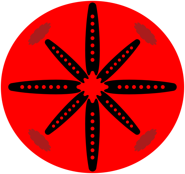 This features a red circle with black dots, which is reminiscent of an orange or tomato. In the center of this circle, there is a large black dot that resembles a star. Surrounding the central black dot are numerous smaller black dots, creating a visually appealing pattern. The overall design gives off a sense of depth and intricacy, making it an interesting focal point in the image.