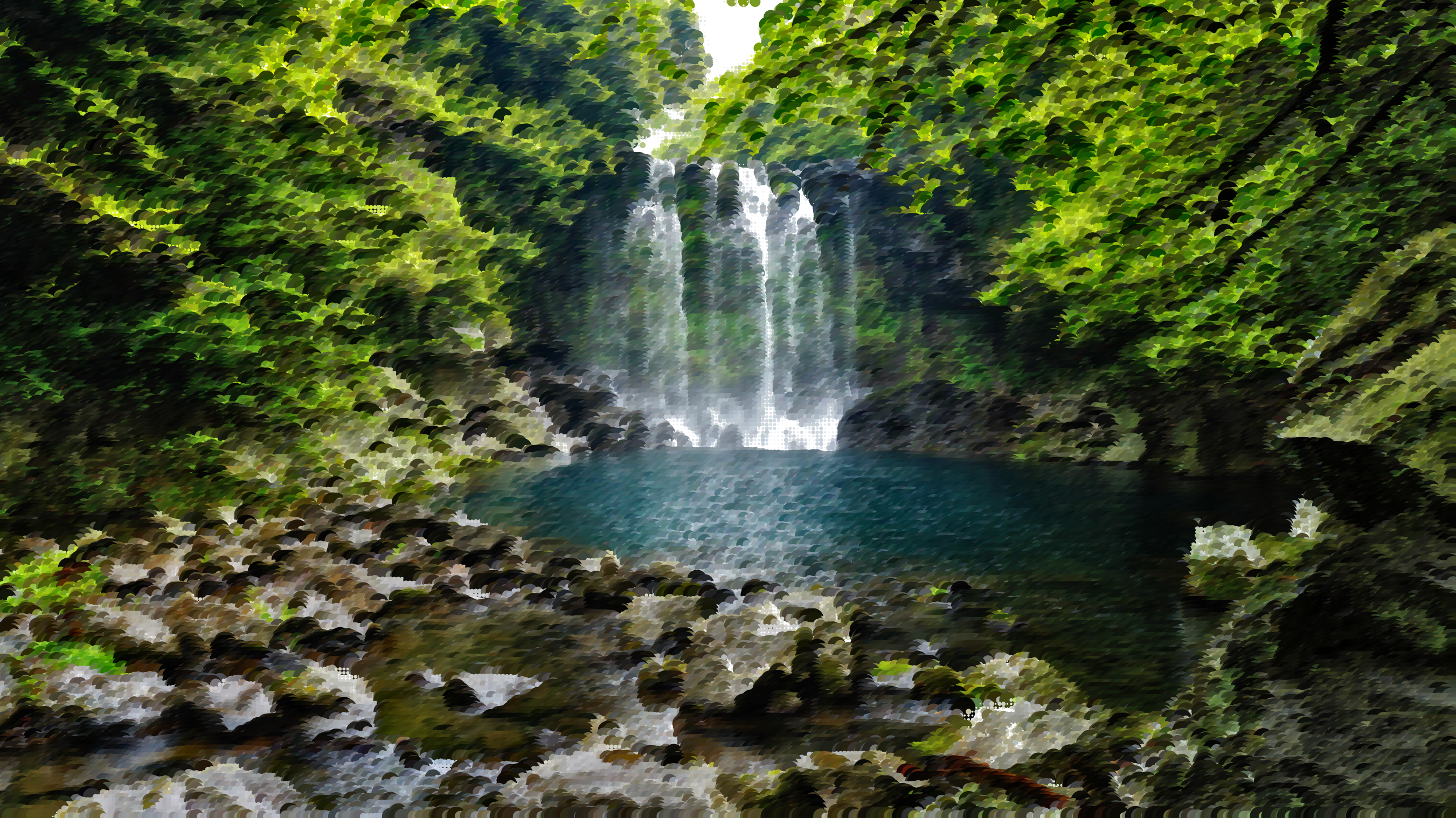 This features a beautiful waterfall surrounded by lush green trees and rocks. The waterfall is located in the middle of a forest, creating an enchanting atmosphere. A small pond can be seen nearby, adding to the serene environment. The scene captures the essence of nature with its vibrant colors and tranquil setting.