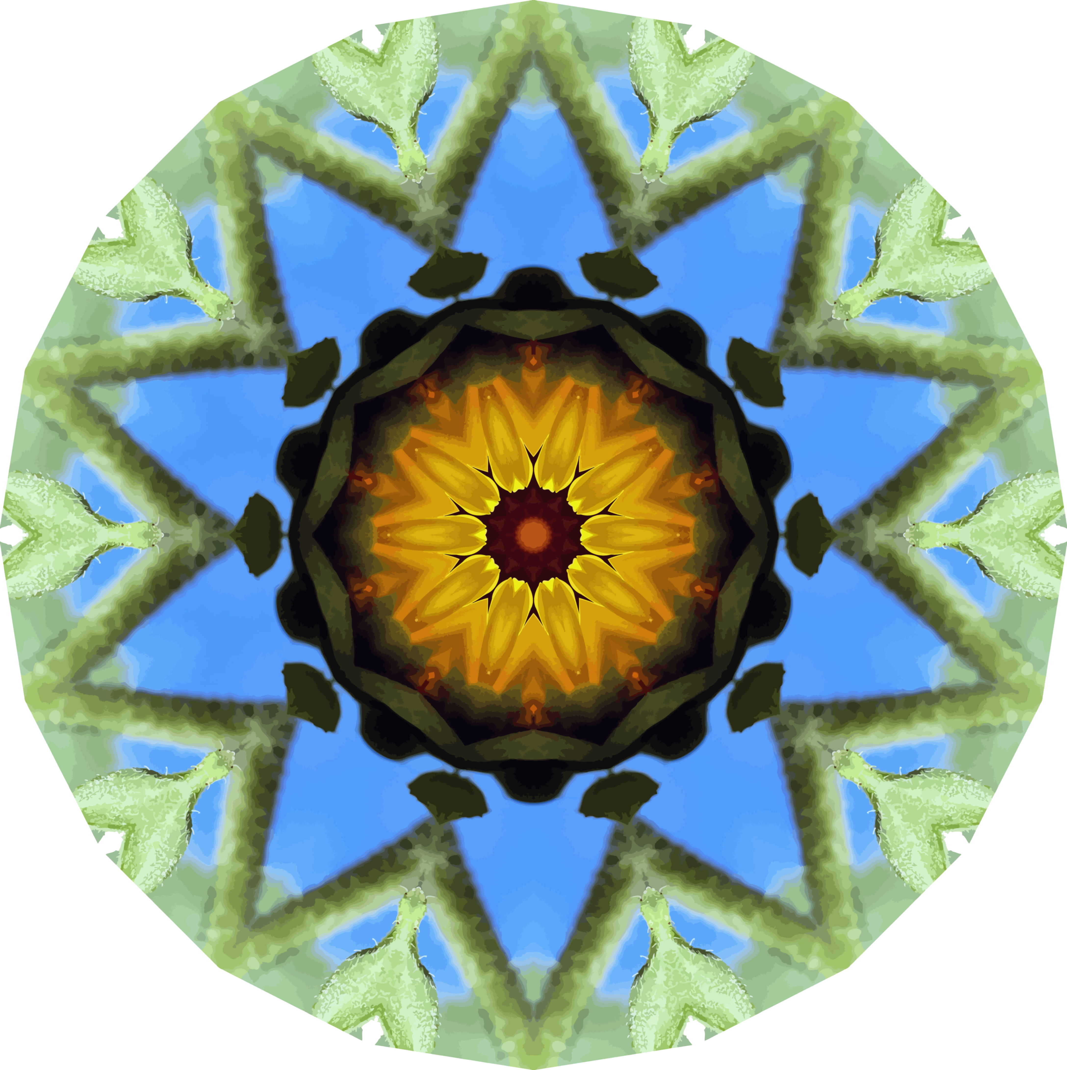 Tags: round, yellow flower, blue background, kaleidoscope sunflower