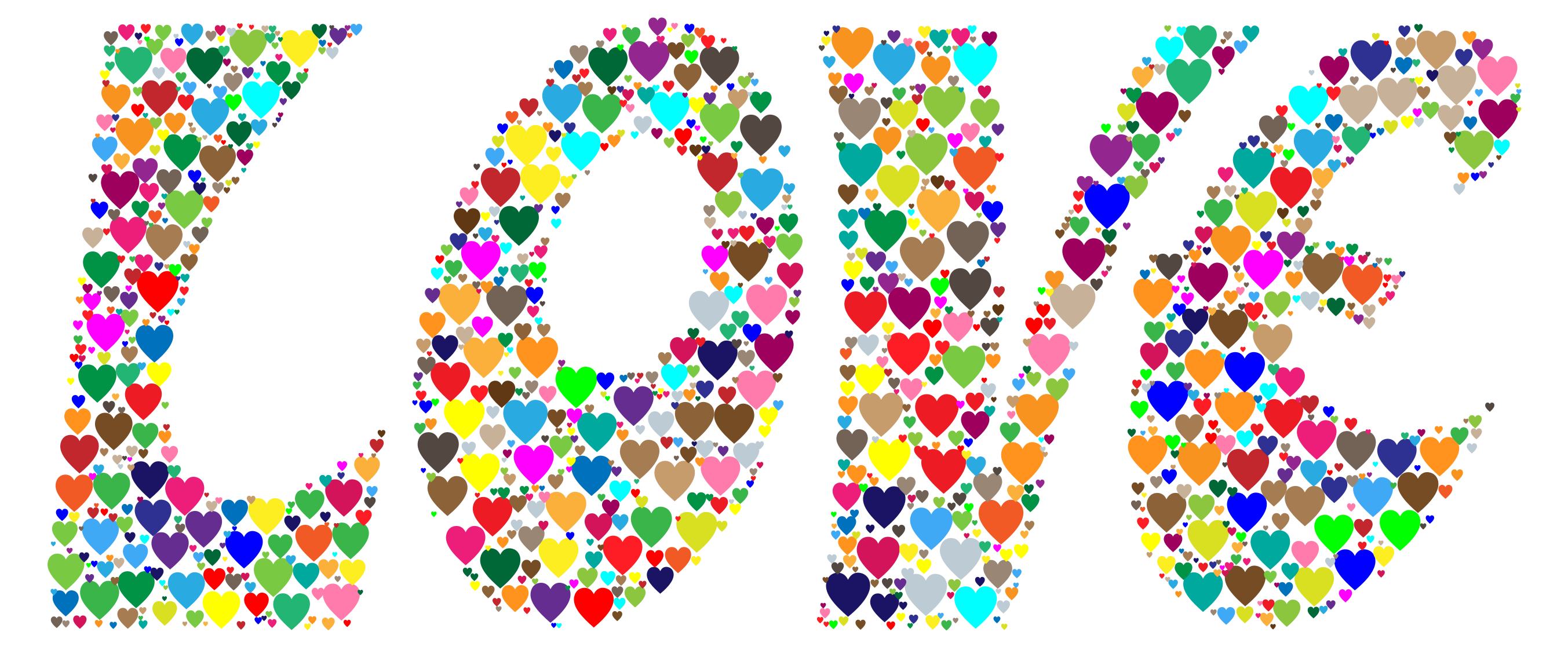 This features a large, colorful sign that reads "LOVE" in various colors and shapes. The letters are made up of hearts, which adds to the overall visual appeal of the sign. The hearts come in different sizes and are scattered throughout the sign, creating an eye-catching display. This unique design could be used for advertising or promoting a product or service related to love, affection, or relationships.
