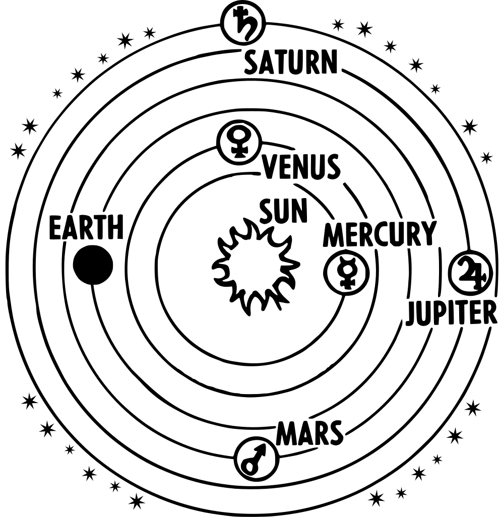 This is a black and white drawing of the solar system, featuring six planets. Each planet has its own name, with Earth being in the center of the system. The planets are arranged around the sun, which is located at the top left corner of the drawing. The other planets include Venus, Mars, Jupiter, Saturn, and Mercury, each positioned in their respective orbits around the sun. The drawing also includes a moon, which can be seen near the bottom right side of the image.
