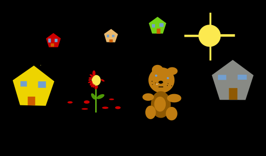 This features a black background with various colorful cartoon houses and bears. There are five different colored houses, each with unique designs, placed throughout the scene. A teddy bear is also present in the middle of the image, adding to the playful atmosphere. Additionally, there are two suns visible in the top right corner of the picture, further enhancing the overall visual appeal and creativity of the scene.