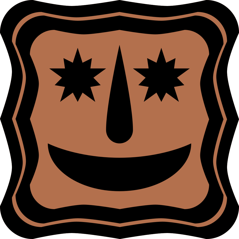 This features a brown and white smiley face with two eyes, a nose, and a mouth. The eyes are located on the top left of the face, while the nose is situated in the middle, and the mouth is positioned at the bottom right corner. This happy-looking emblem appears to be made from a combination of black and brown colors, giving it a unique and playful appearance.