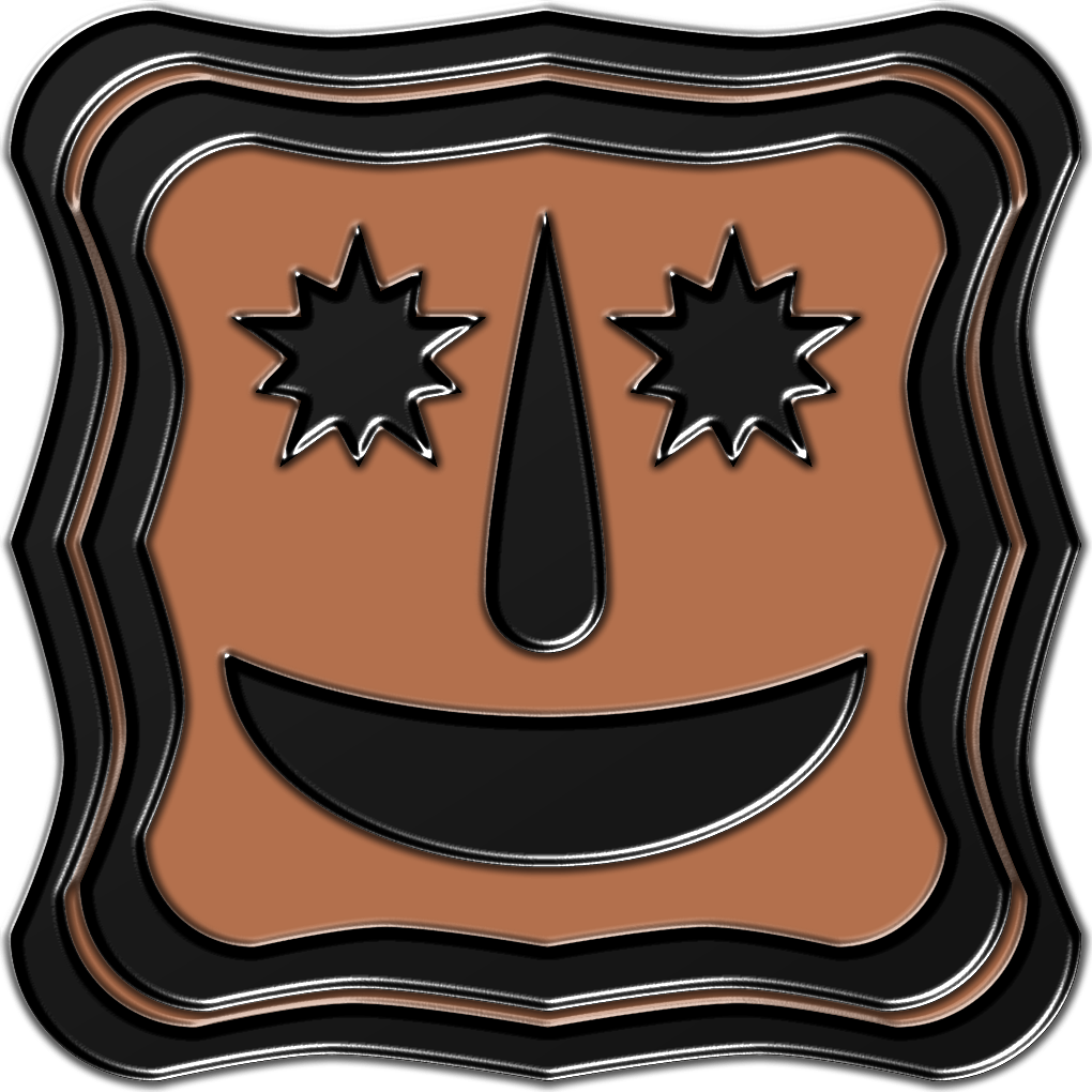 This features a brown and black face with two eyes, a nose, and a mouth. The eyes are represented by two white stars, while the nose is shaped like a drop. The mouth has a smile created from a squiggly line. This unique design gives the impression of a happy or playful expression. The face appears to be made up of various graphic design elements, such as the stars and the drop for the nose, which adds character and creativity to the overall appearance.