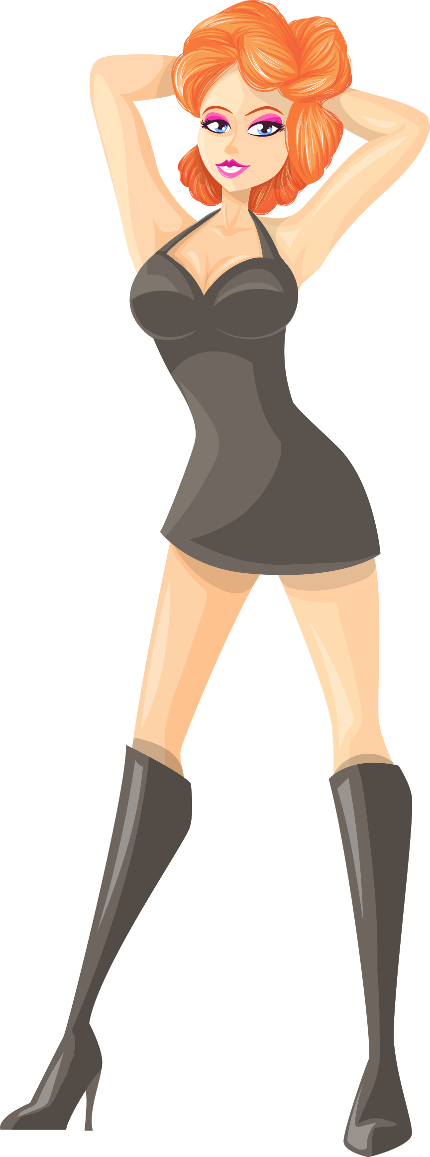 This features a cartoon woman wearing a black dress and high heels. She is posing for the camera, with one hand on her hip and the other on her head. Her outfit appears to be tight-fitting and revealing, emphasizing her curves. The woman's pose suggests confidence and allure, as she showcases her attire in a flirtatious manner.