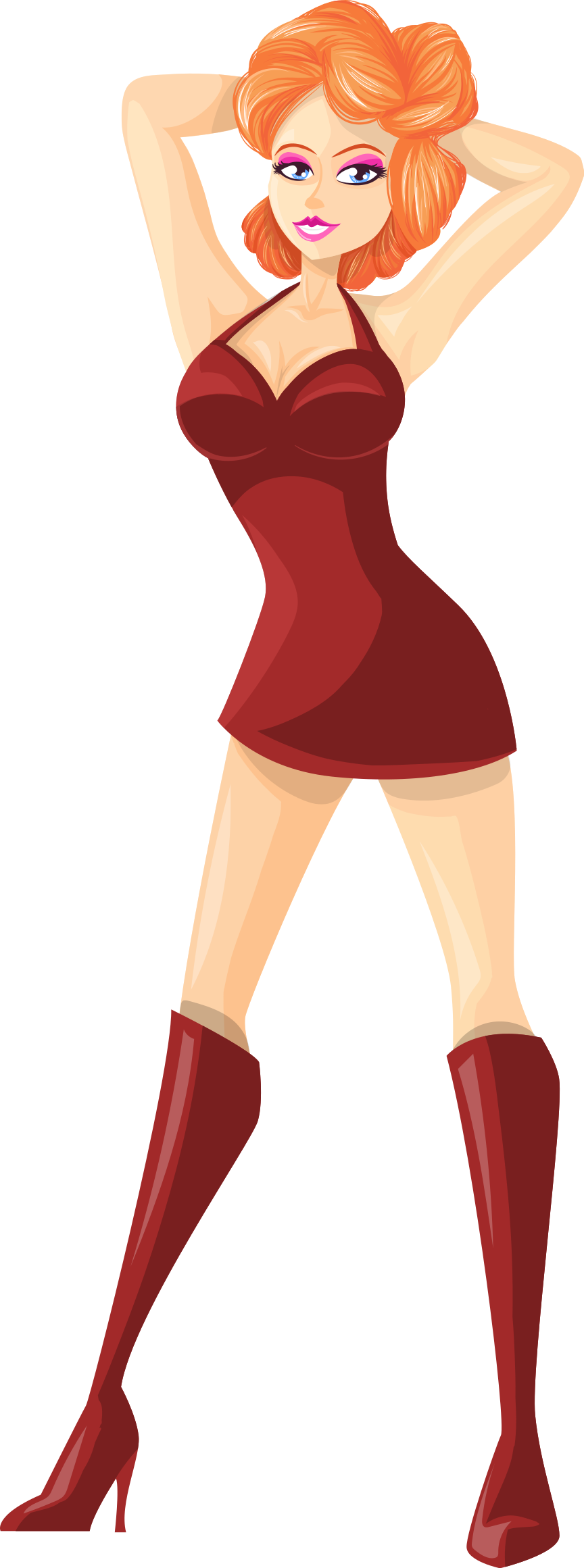 This features a cartoon woman wearing a red dress and high heels. She is posing for the camera, with one hand on her hip and the other on her head. Her outfit appears to be a combination of a corset and a short skirt, giving her an elegant yet playful appearance. The woman's pose suggests confidence and poise, as she showcases her unique style in this eye-catching ensemble.