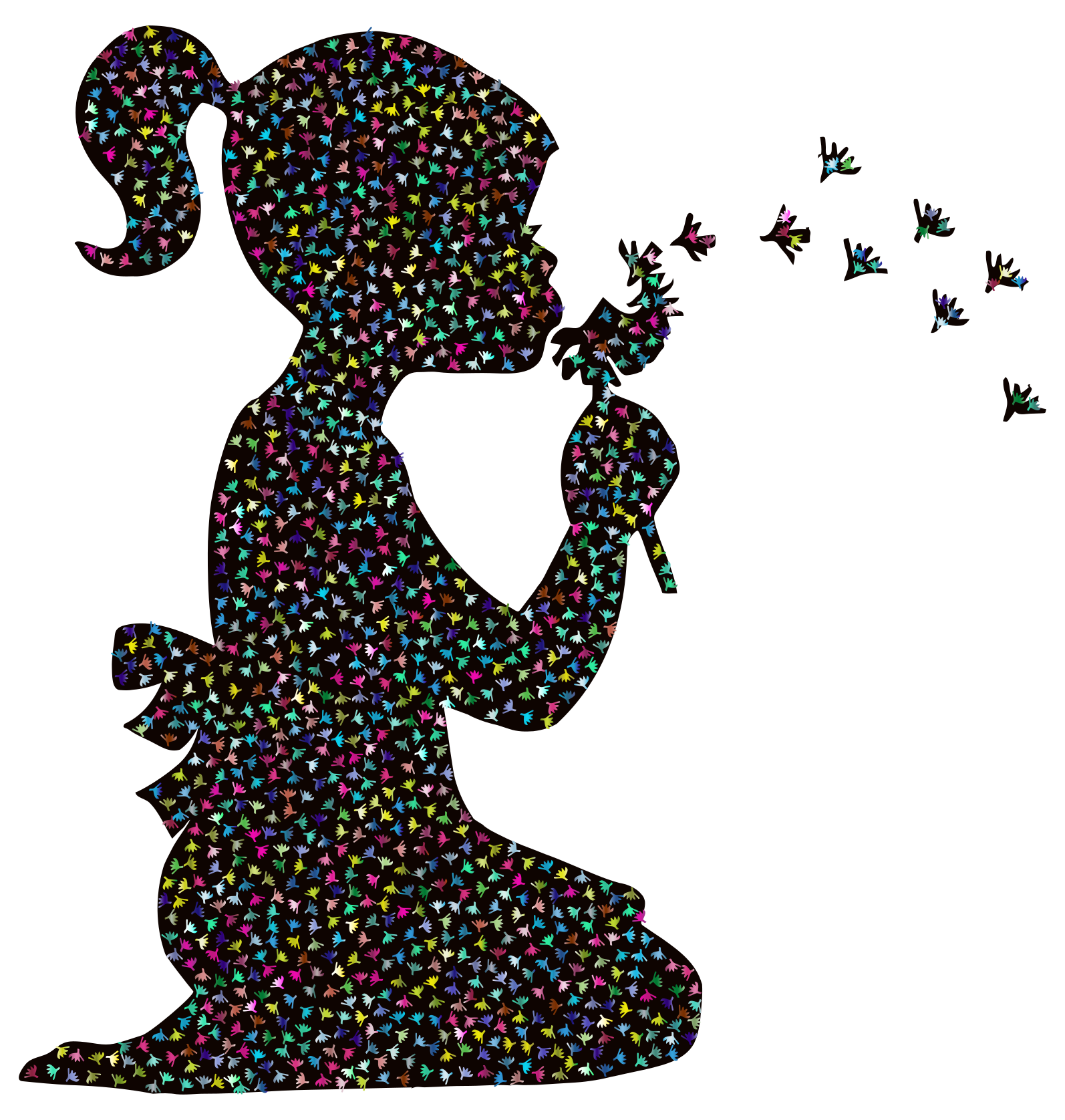 This features a little girl with her mouth open, blowing bubbles. She is surrounded by a multitude of colorful dots that make up the background and create an interesting visual effect. In addition to the main character, there are several birds scattered throughout the scene, adding more life and detail to the picture. The combination of the girl's playful action and the vibrant colors creates a lively and engaging atmosphere in this artistic representation.