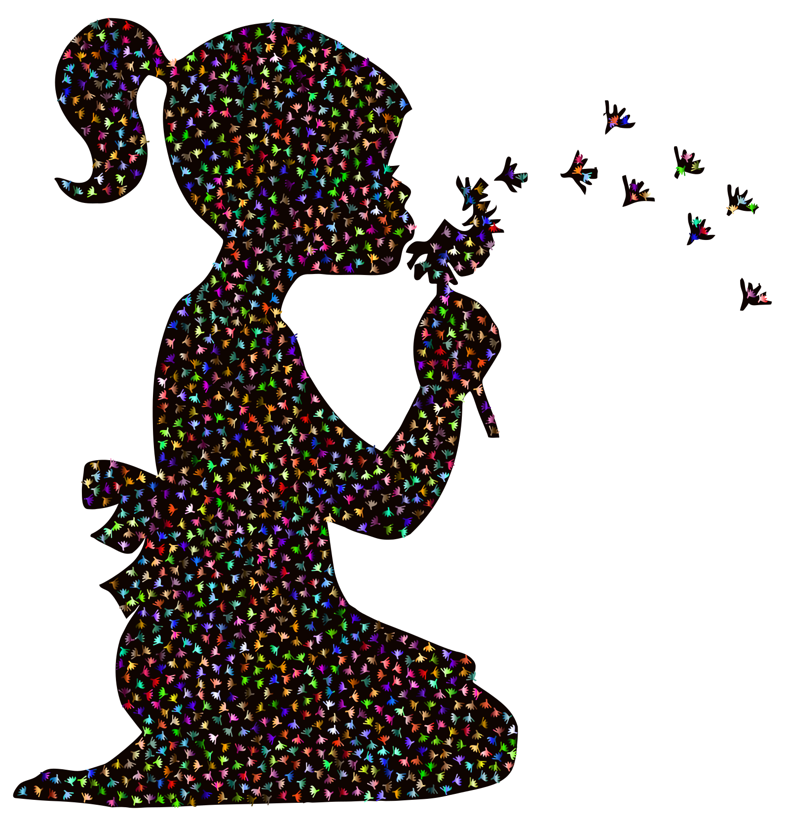 This features a colorful illustration of a little girl with her mouth open, as if she is blowing bubbles. She has long hair and appears to be wearing a bow in her hair. The illustration is made up of various colored dots that create the overall appearance of the girl. In addition to the main subject, there are several birds scattered throughout the image. Some of these birds can be seen flying near the top right corner of the picture, while others are positioned closer to the center and bottom left area. The combination of the little girl's illustration and the presence of the birds creates a lively and playful atmosphere in the image.